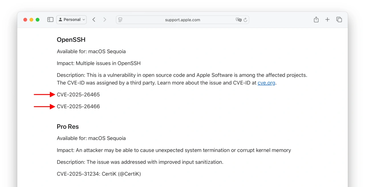 今年03月31日にリリースされた「macOS 15.4 Sequoia」や「macOS 14.7.5 Sonoma & macOS 13.7.5 Ventura」でも、OpenSSHを「OpenSSH v9.9p1」へアップデートし、アプリがユーザーの機密データにアクセスできる可能性がある脆弱性(CVE-2025-24246)を修正しているので、macOSユーザーの方は時間を見つけて最新のmacOSへアップデートすることをオススメします。