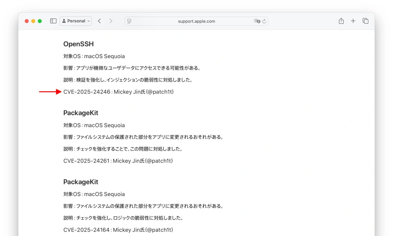 AppleがmacOS 15.5 SequoiaでOpenSSHを「OpenSSH 9.9p2」にアップデートし2件の脆弱性を修正しています。詳細は以下から。