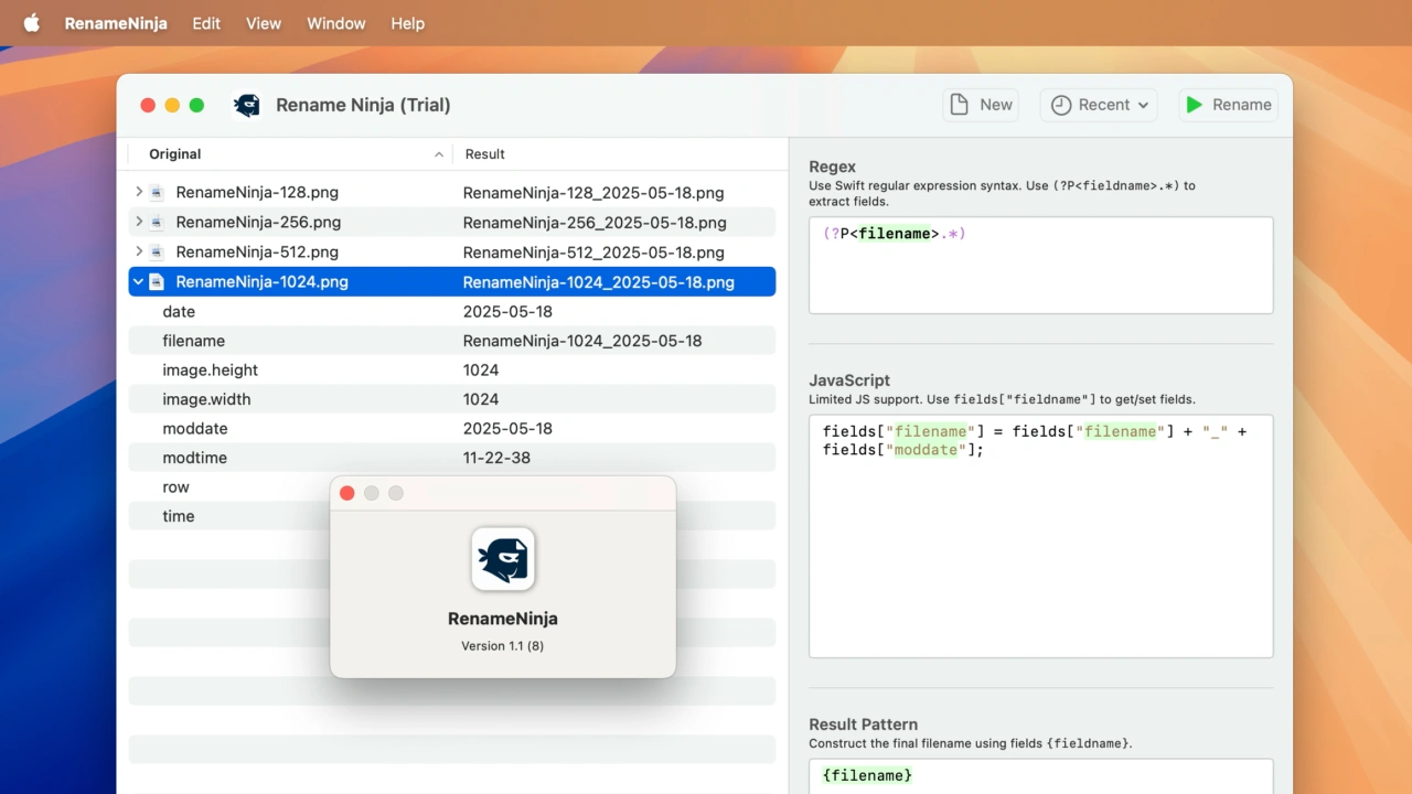 この様なシンプルなリネーム機能では物足りない開発者向けに、正規表現(Swift Regular Expressions)とJavaScriptを利用しメタデータなどの情報からファイルの名前付けが可能なMac用リネームアプリ「RenameNinja」がリリースされています。