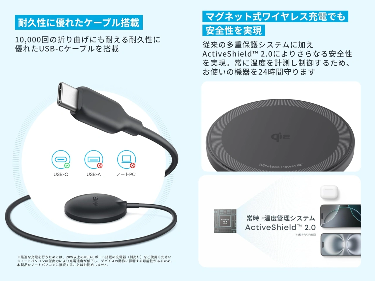 また、ケーブルは10,000回の折り曲げにも耐える高耐久のUSB-Cケーブルを採用し、従来の多重保護システムに加え1秒あたり約35回の温度監視を行うActiveShield 2.0にも対応。