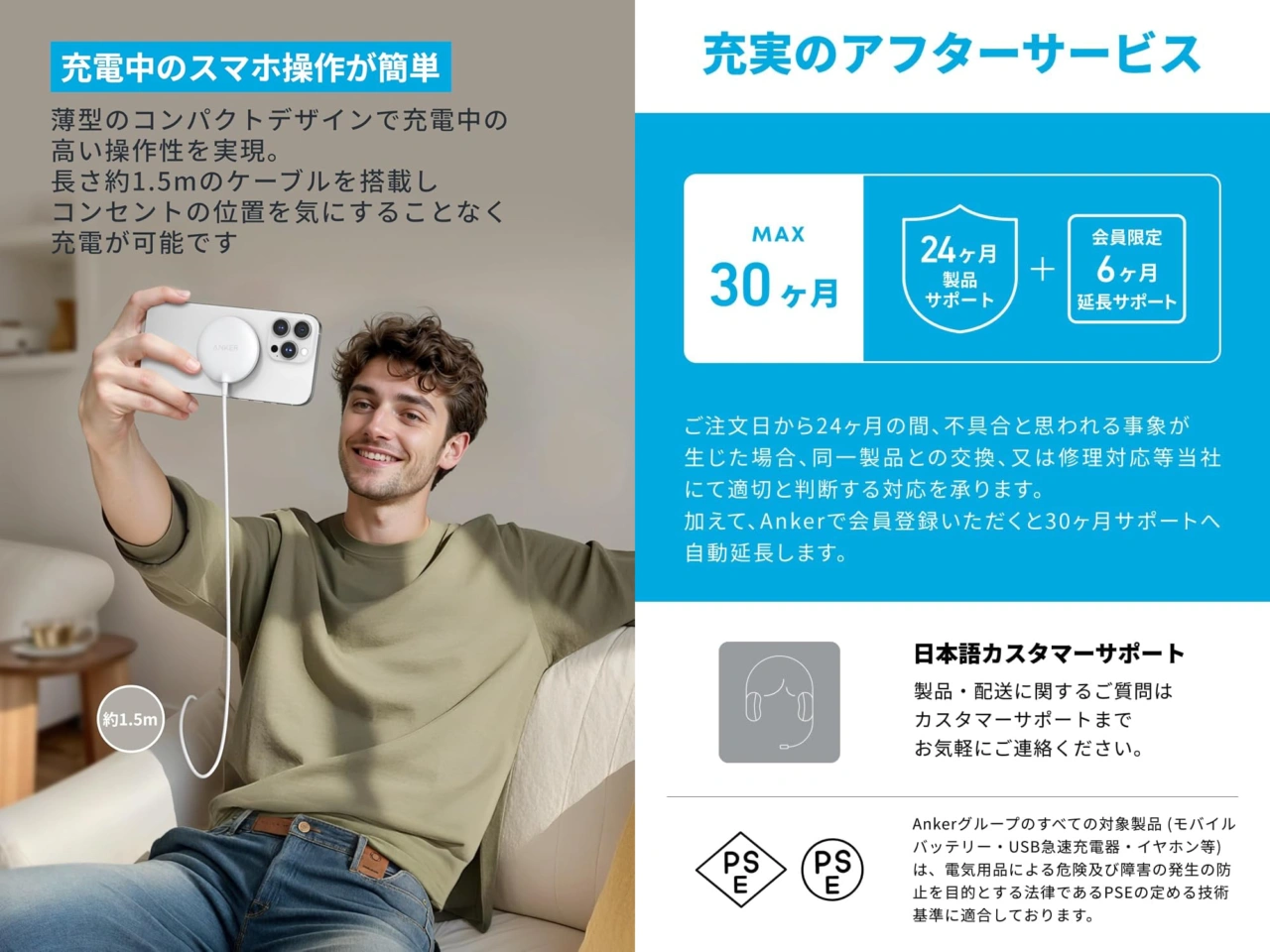パッケージには充電器本体と取扱説明書、24ヶ月の製品保証とAnker会員の6ヶ月延長保証が付いて、価格は2,990円と旧モデルより安くなっており、現在は発売を記念してAmazon.co.jpと楽天市場の公式ストアで20%OFFクーポンが配布されているので、Qi2対応充電器を探していた方はチェックしてみてください。