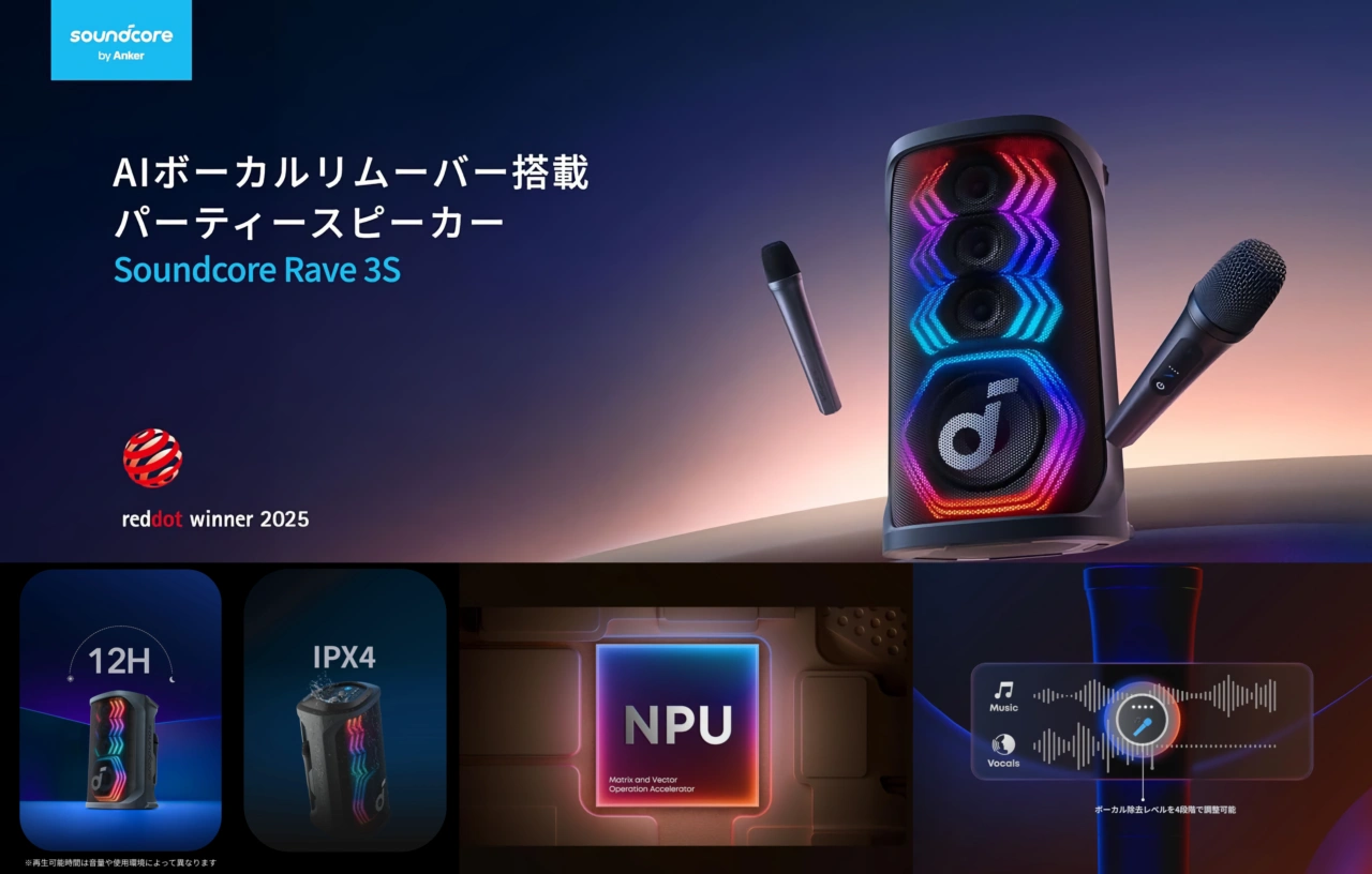 Anker Japanが独自のAIアルゴリズムによりボーカル音を除去できるAIボーカルリムーバー機能を備えた最大200W出力のカラオケスピーカー「Soundcore Rave 3S」を発表しています。詳細は以下から。