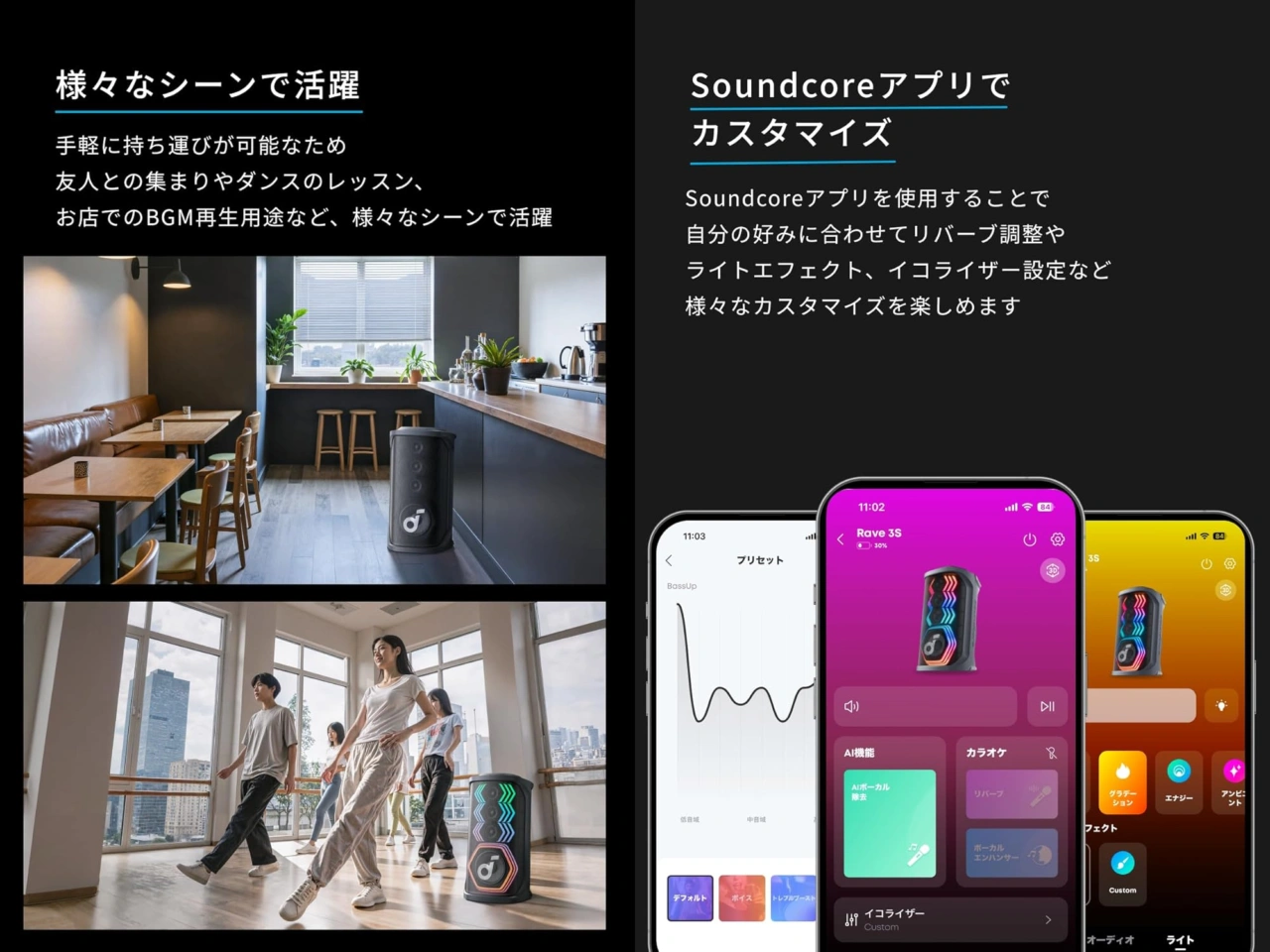 Anker独自のAIアルゴリズムによりボーカルと楽器音を分離させ、あらゆる音源からボーカル音を除去しカラオケ音源に変更可能。[…]6.3cmのフルレンジユニット3つと16.5cmのウーファーを1つ搭載し、最大200Wの迫力あるサウンドを実現。