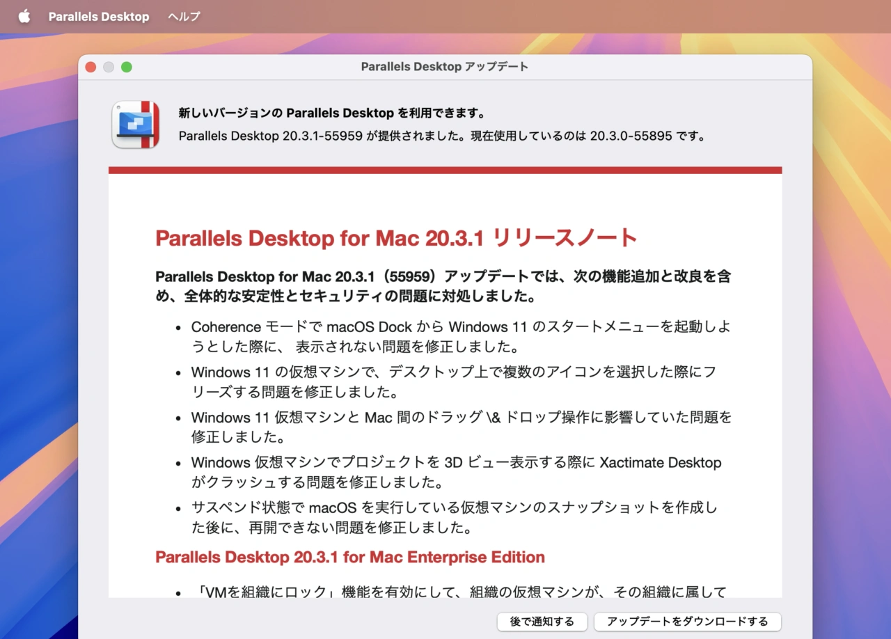 Parallels Desktop for Mac 20.3.1(55959)アップデートでは、次の機能追加と改良を含め、全体的な安定性とセキュリティの問題に対処しました。