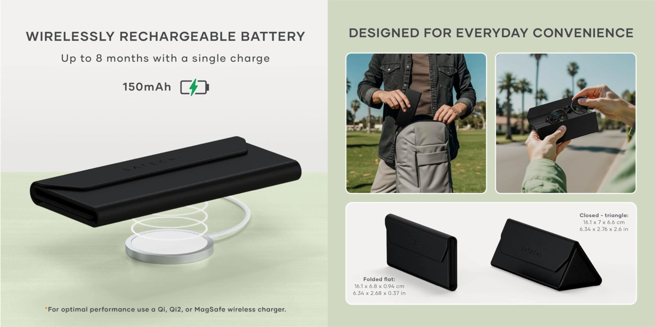 また、カード内には最大16ヶ月使用が可能な220mAhのバッテリーを搭載し、カード内のバッテリーはQi, Qi2, MagSafeワイヤレス充電器にカードを置くだけで再充電できるため繰り返して利用することが可能。