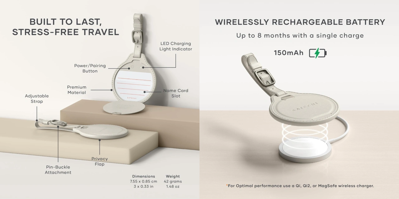 トラッカータグ本体にはLED充電インジケーターと電源/ペアリングボタン、ネームカードスロット、ストラップ、バックルに加え、1回の充電で約8ヶ月の利用が可能な150mAhのバッテリーが搭載されており、バッテリーはQi/MagSafeワイヤレス充電器に載せるだけで再充電でき繰り返し利用することが可能になっています。