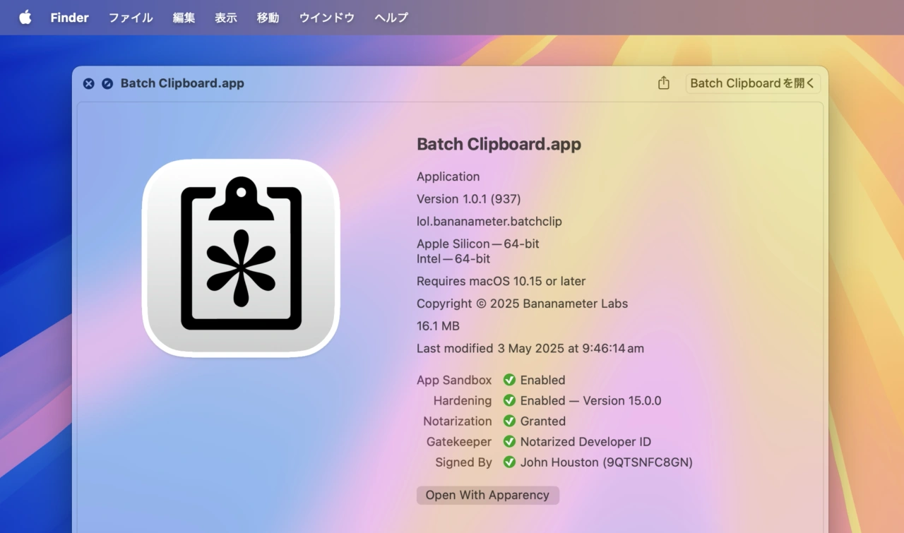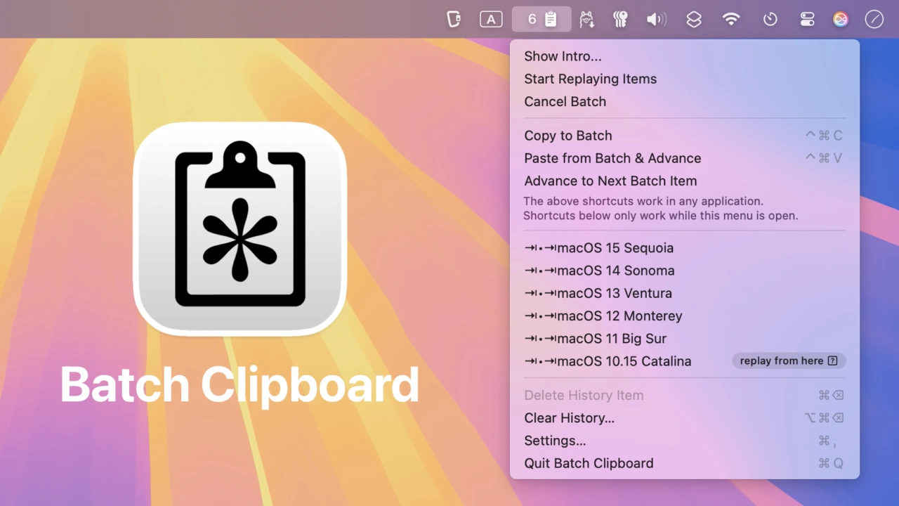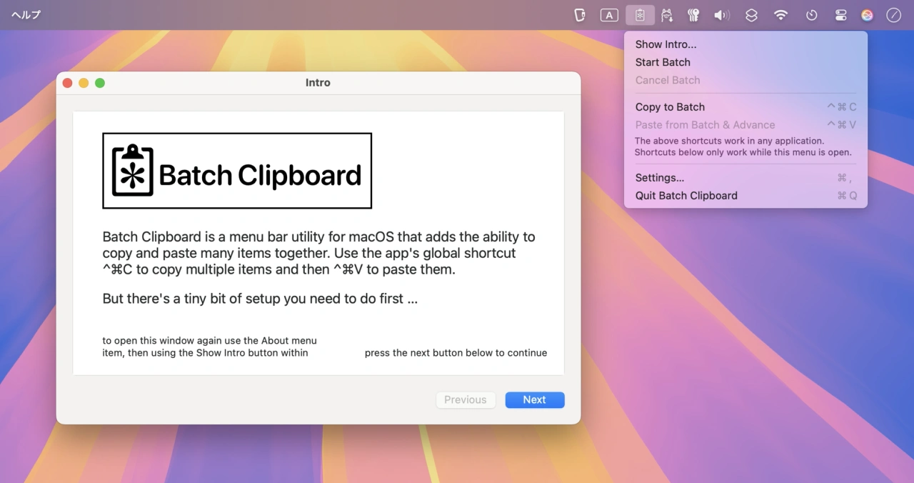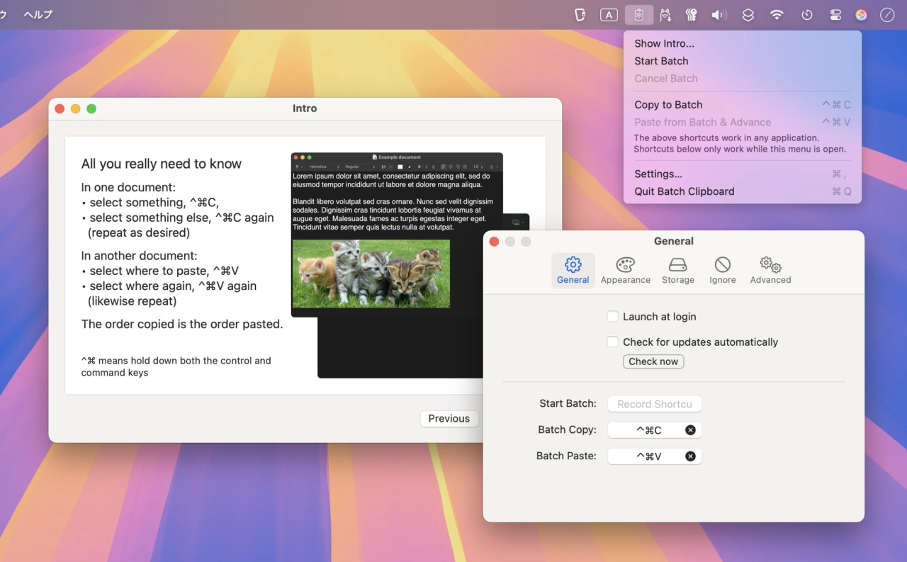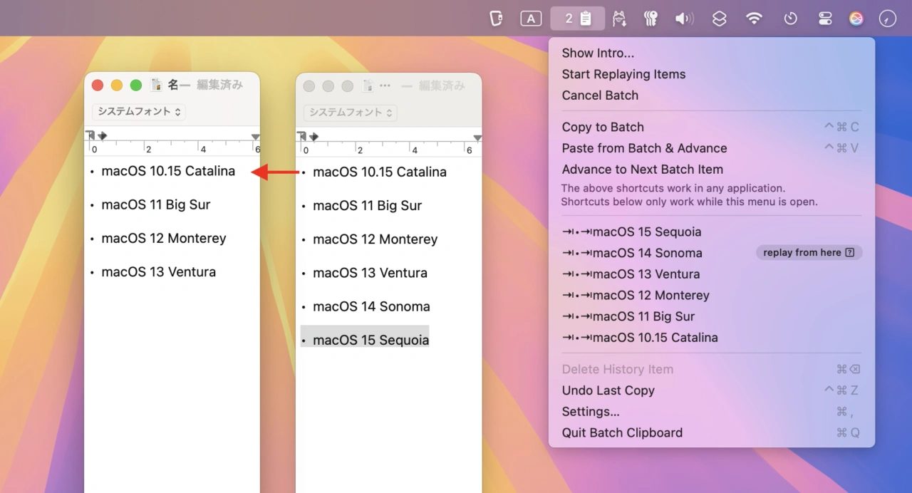 Batch Clipboardはオープンソースのクリップボードアプリ「Maccy」をベースにJohn Houstonさんが開発したアプリで、ショートカットキーControl + Command + Cでテキストや画像をコピーするとコピーした内容が一度キューに保存され、コピーが終わったら別のドキュメントでControl + Command + Vを押すことで、コピーを始めた項目から順に連続してペーストできる機能があります。