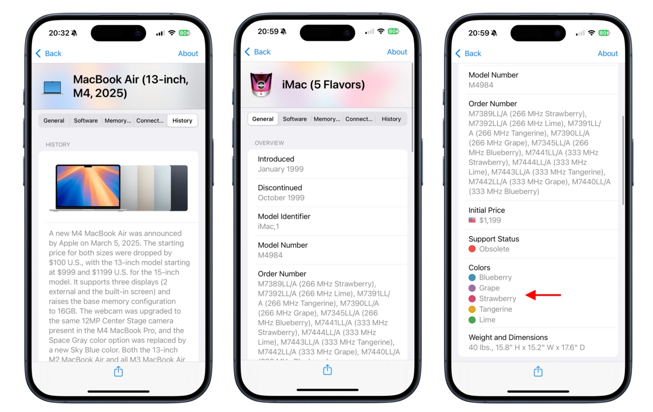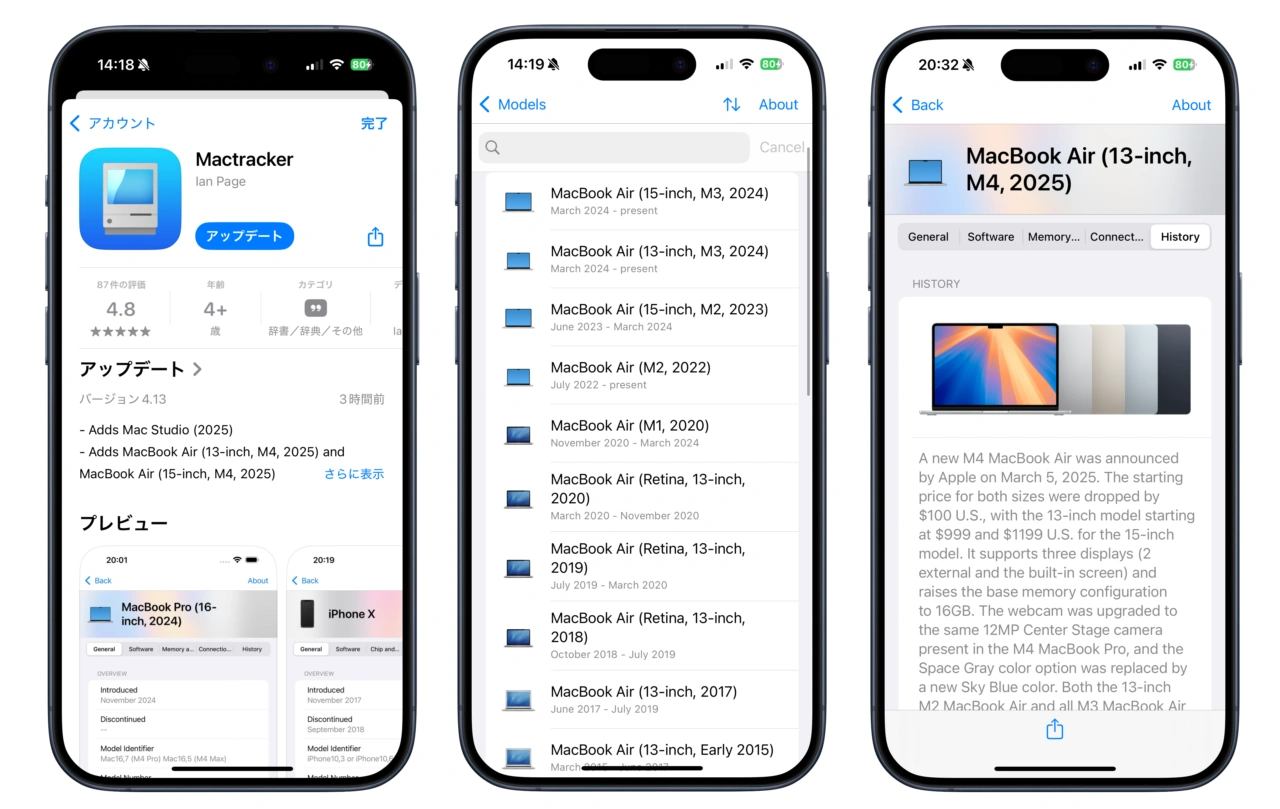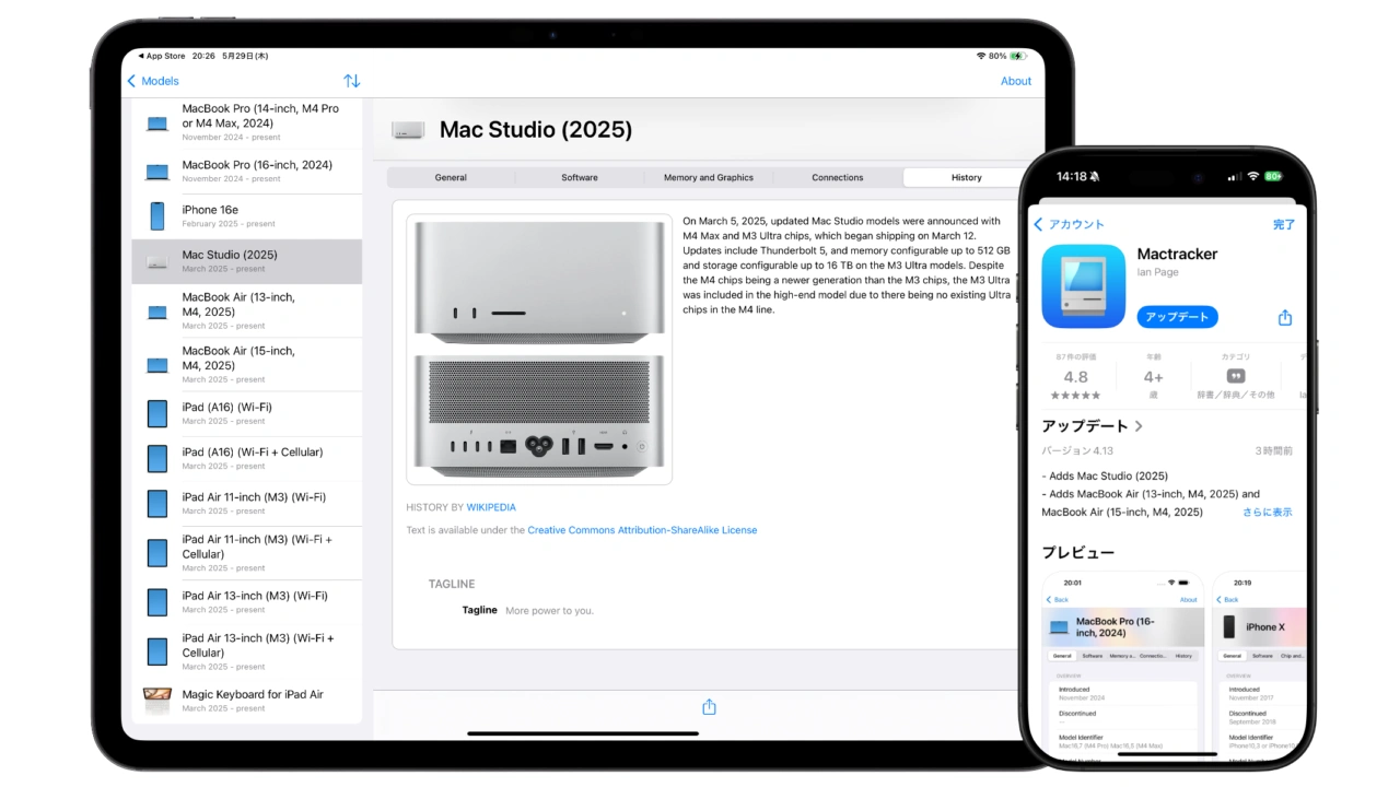 Mactracker v4.13では、2025年に発売されたApple M3 UltraやM4 Maxチップを搭載した「Mac Studio (2025)」や「MacBook Air (13/15インチ, M4, 2025)」、「iPad Air (M3)」、「iPad (A16)」、最新のアクセサリー情報が追加された他、1977年から現在に至るまでの殆どのAppleデバイスのカラーサンプルを調べ上げて情報に追加したそうです。
