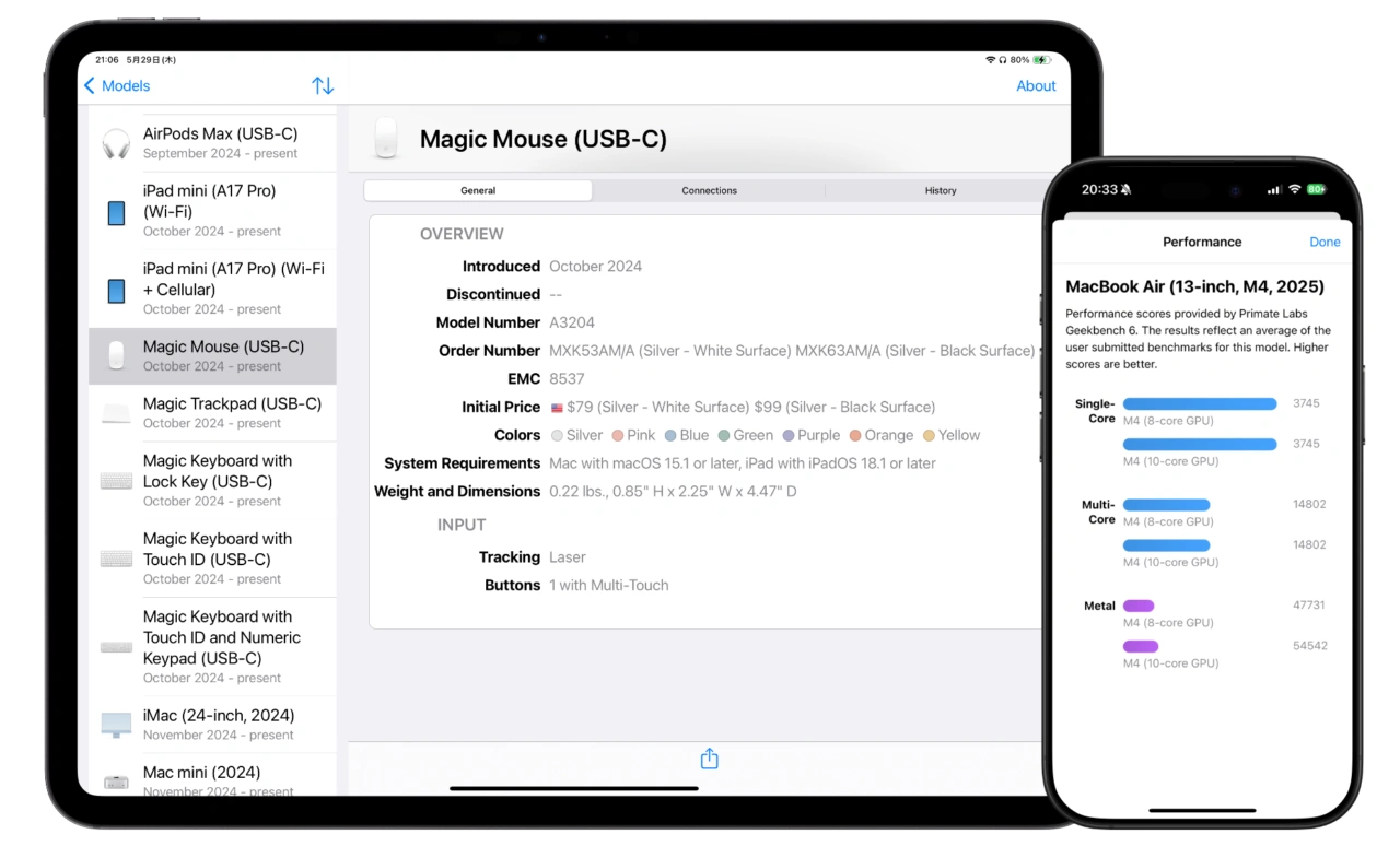 この他、Mactracker v4.13ではiPadの外部ディスプレイ対応情報、最新のOS情報、ビンテージ/オブソリート製品のアップデート、iPadでのDynamic Type(iPadOSデフォルトのテキストサイズ変更)、Geekbenchのパフォーマンススコア表示の改善が行われているので、Appleデバイスの情報を知りたい方はチェックしてみてください。