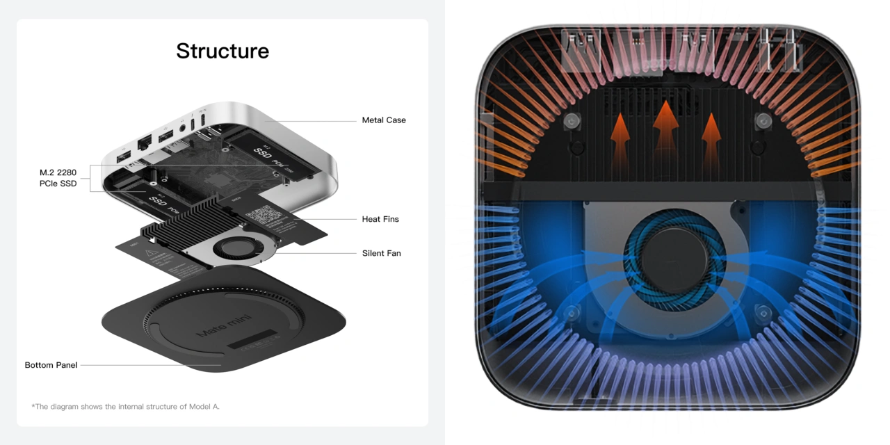 また、Thunderbolt 5など高速なNVMe SSDではNANDチップやコントローラーが発する熱によりパフォーマンスが低下するサーマルスロットリングが起こりがちですが、Beelink Mate miniはこの対策として内部にアクティブクーリングファンと大型のヒートシンクが搭載され、さらにMac miniと同じ吸気と排気を分ける冷却ベント(Vents)により、SSDが高温にならないようにデザインされているそうです。