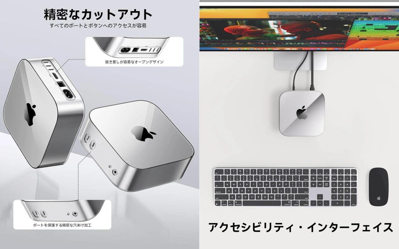 Mac mini前面のUSB-Cポートや3.5mmヘッドホンジャック、背面のThunderbolt、Ethernet、HDMI、電源ポート全てにアクセスできるようカットアウトが施されており、底面の通気(吸気/排気)口は塞がないデザインで、上から被せるだけで装着することができるようになっています。