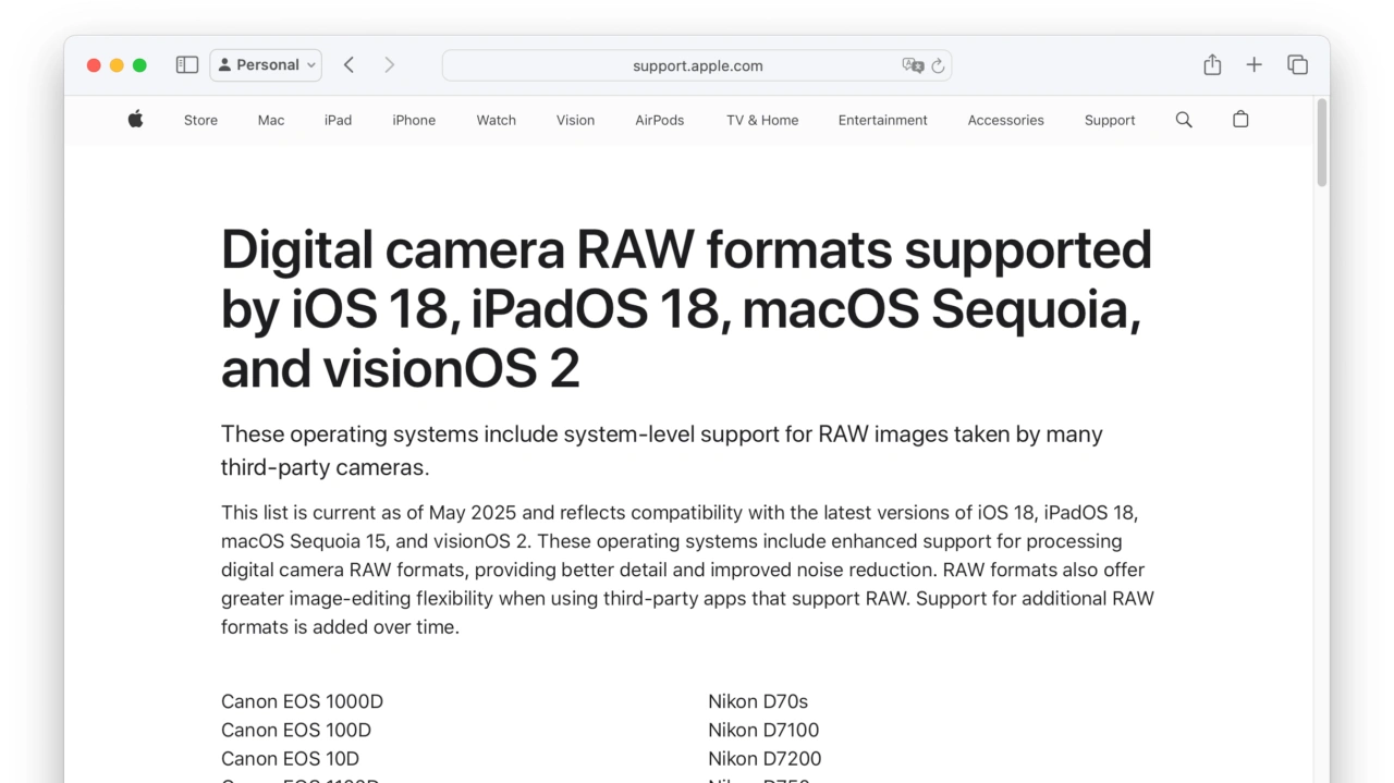 Digital camera RAW formats supported by iOS 18, iPadOS 18, macOS Sequoia, and visionOS 2 – Apple Support