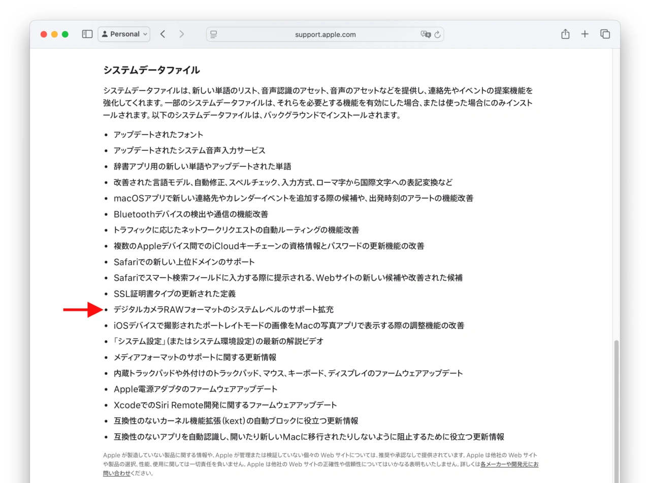 RAWフォーマットの追加サポートはmacOSのセキュリティ機能XProtectやフォントなどと同じく「システムデータファイル」に分類されており、アップデートは段階的にロールアウトされ、サポートされたRAWフォーマットはApple製の写真やプレビューアプリはもちろん、サードパーティ製のアプリでも処理できるようになっているので、対象のカメラをお持ちの方はチェックしてみてください。