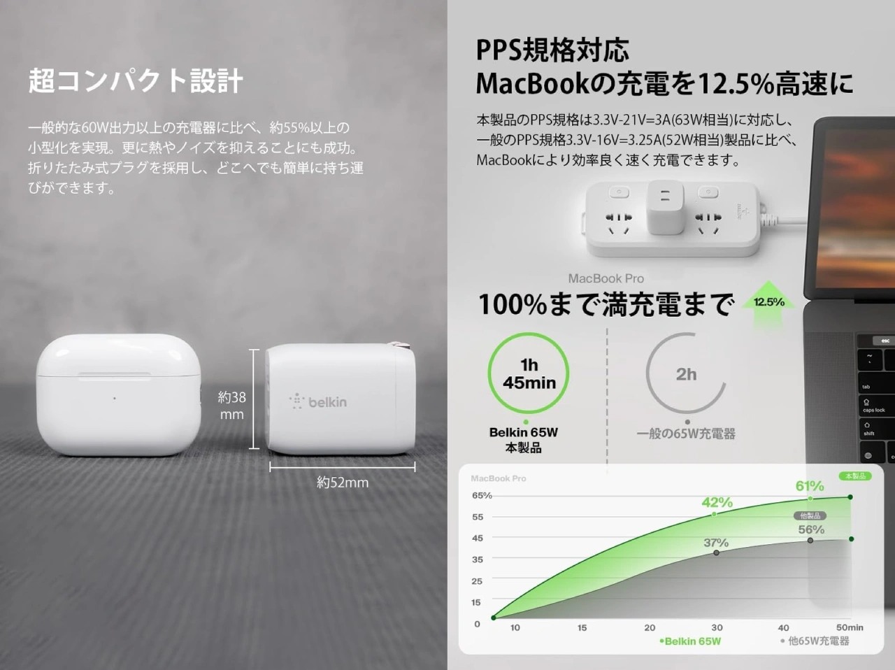 Belkin Dual USB-C Wall Charger 65W for Nintendo Switch 2はGaNを採用し、サイズが約52.49 x 39 x 40.6mmと一般的な60W USB-C電源アダプタと比較して約52%以上コンパクトな設計で、プラグも折りたたみ式プラグを採用。