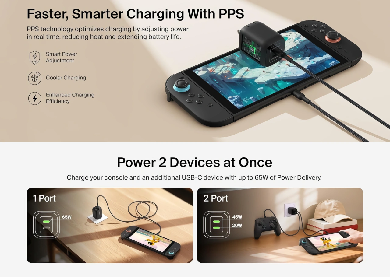 単ポート使用では最大65Wで、2ポート使用でも最大45Wと20W出力でNintendo Switch 2とコントローラーを同時に充電できるようになっており、接続されたデバイスに応じて充電器の出力電圧を調整するUSB-C PD 3.0 PPS(Programmable Power Supply)にも対応。