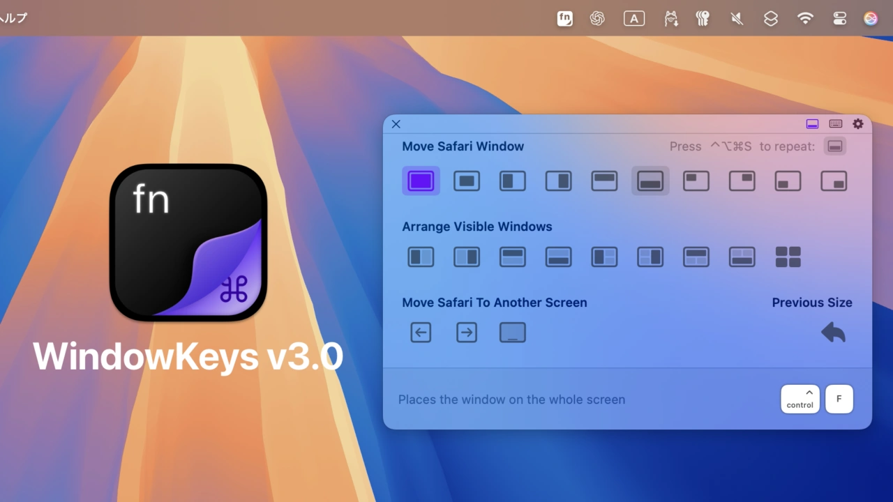 WindowKeysはリリース当初(v1.0)、macOS 15 Sequoiaの新機能であるタイル表示のウィンドウマネージャー機能を地球儀キー(🌐:Globe Key)がないサードパーティ製キーボードでも利用できるようにしてくれるユーティリティとして公開されていましたが、WindowKeys v3.0では[Window Moving]ボタン/ショートカットキーが追加されており、