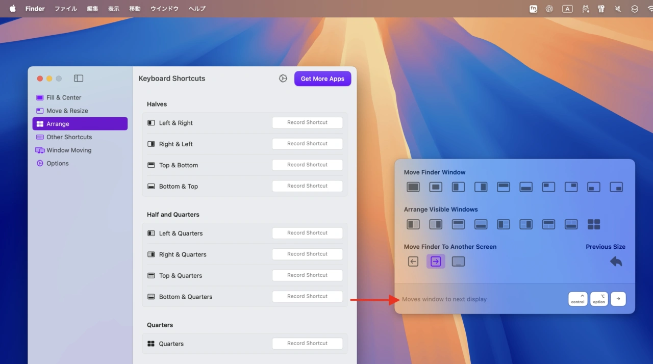 マルチディスプレイ環境で、ディスプレイ間をまたいでウィンドウを移動できるようになっており、このWindow Moving機能にはiPadをMacのセカンドモニターとして利用するSideCar機能をサポートしているため、Macのアプリケーションウィンドウを瞬時にiPadへ移動することも可能となっています。