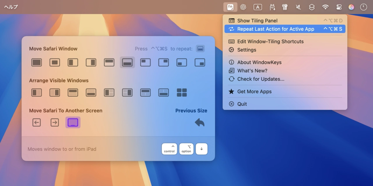 この他、WindowKeys v3.0では、特定のアプリに対して行ったタイル表示を記憶し、ショートカットキー(Control + Option + Command + S)で瞬時にもとのタイル表示に戻すリピート機能が追加されています。