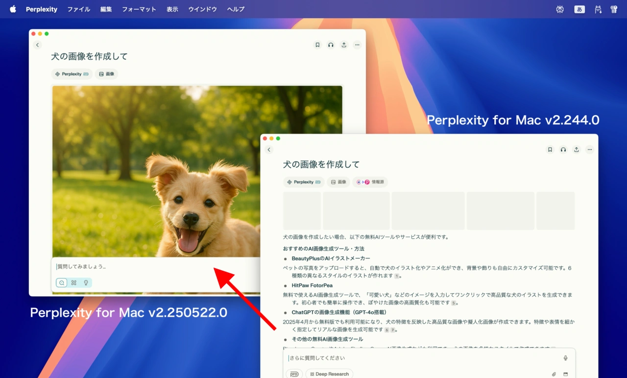 また、Perplexity for Mac v2.250522.0では、これまでWeb版でしか対応していなかった画像生成がサポートされ、OpenAIのGPT Image 1 (Default)/DALL-E 3、Google Gemini 2.0 Flash Experimental、Black Forest Labs FLUX.1モデルを使用した画像生成が可能になっています。