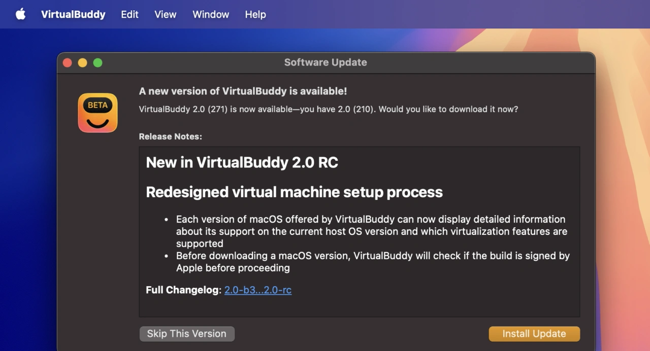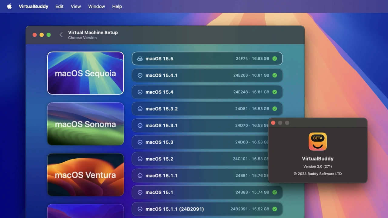 - Each version of macOS offered by VirtualBuddy can now display detailed information about its support on the current host OS version and which virtualization features are supported