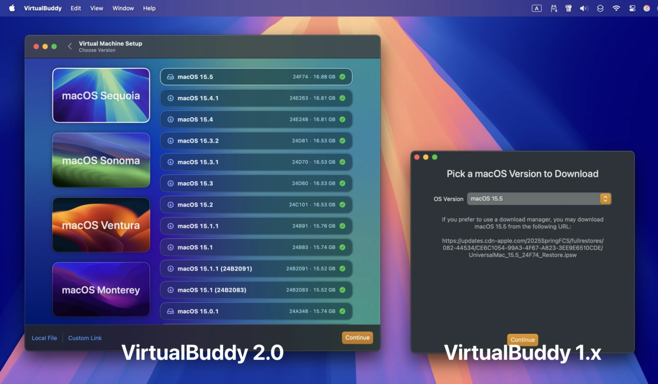 VirtualBuddy 2.0 RCとVirtualBuddy 1.xのセットアップ画面