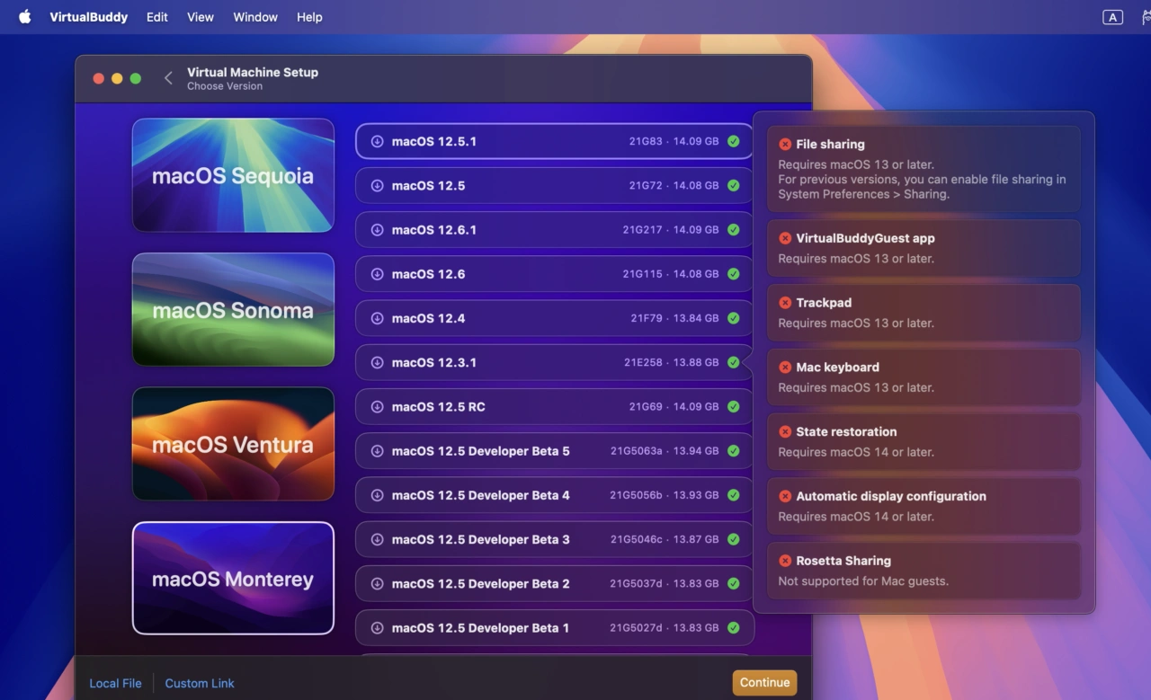 様々な機能がホスト&ゲストmacOSのAVFに依存していますが、VirtualBuddy 2.0では、これらの機能が作成しようとしているmacOS仮想マシンで利用できるかを確認できるようになっており、macOSインストーラーリスト横のチェック(✅️)または注意(⚠️)マークをクリックすることで、現在のホストmacOSとゲストmacOSの組み合わせで利用できる/出来ない機能が確認できるようになっています。