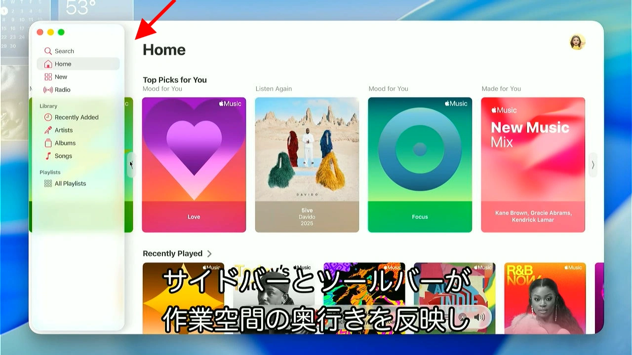 Liquid Glassデザインにより、ウィジェットやDock、アプリケーションアイコンが美しく映し出されるようになり、