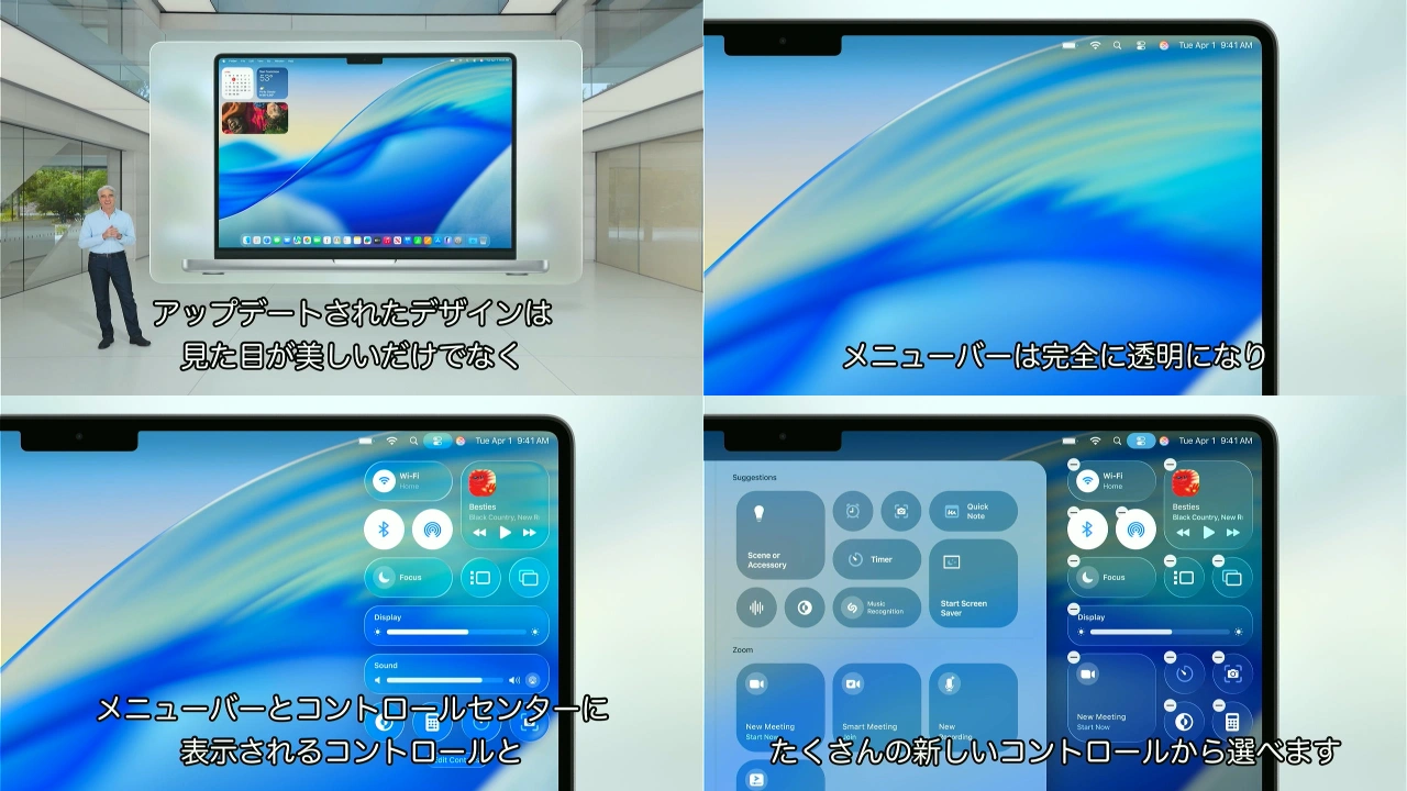 また、macOSの特徴とも言えるメニューバーは、Liquid Glassデザインにより完全に透明になりディスプレイをより広く感じられるそうで、メニューバーとコントロールセンターに表示されるコントロールと、レイアウトもカスタマイズする方法が増えるそうです。
