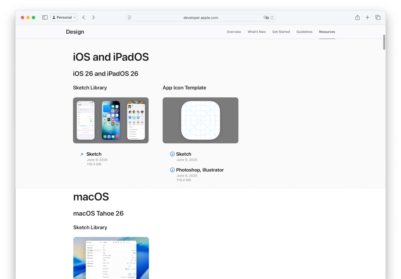 Appleは開発者やデザイナー向けに各OSのUI KitやデバイスのモックアップなどのデザインリソースをFigmaとSketchで公開していますが、現在のところmacOS 26 TahoeとiOS 26/iPadOS 26のデザインリソースはSketchのみで提供されています。