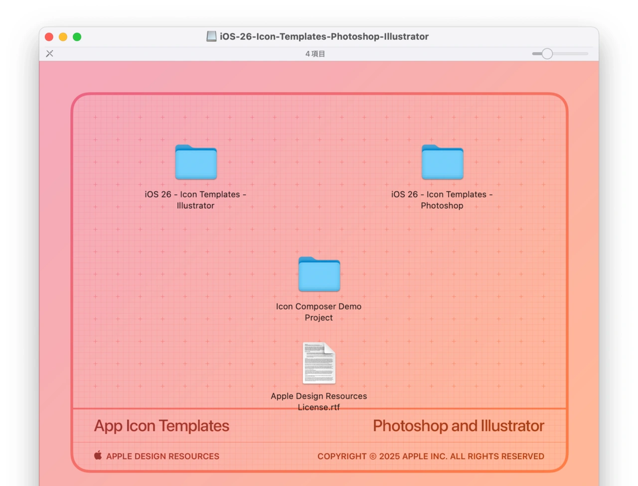 また、macOS 26 TahoeやiOS 26/iPadOS 26ではアイコンもデザインが刷新されるため、開発者はアプリのアイコンのアップデートも行わなければなりませんが、それに合わせてAppleはPhotoshopとIllustrator形式でアイコンテンプレートも公開されており、