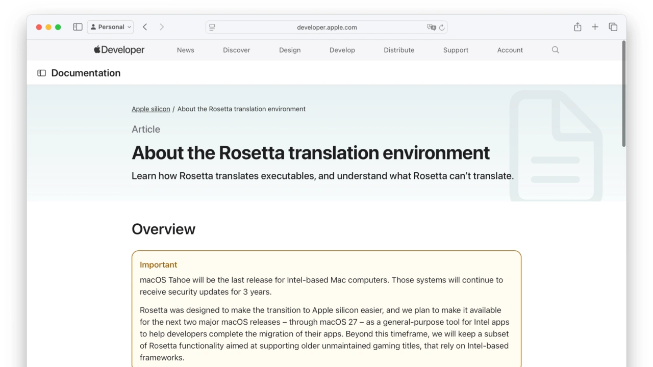 Rosetta was designed to make the transition to Apple silicon easier, and we plan to make it available for the next two major macOS releases – through macOS 27 – as a general-purpose tool for Intel apps to help developers complete the migration of their apps.