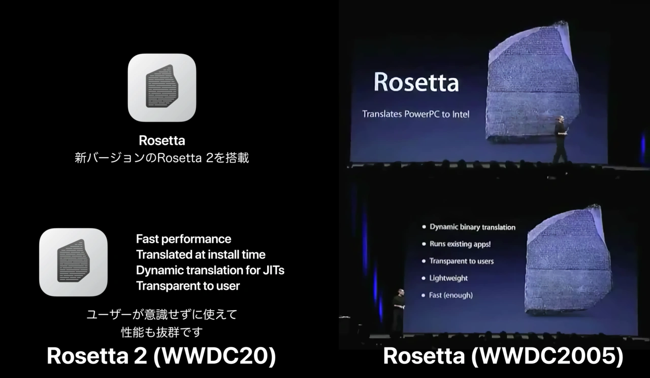 Rosettaは、Appleが2005年06月に開催したWWDC2005で発表したPPCアプリをIntel Macで動作させるためのバイナリトランスレーターで、その15年後のWWDC20において、今度はIntelアプリをApple Silicon Macで動作させるための「Rosetta 2」が発表され、macOS 11 Big Surから提供が開始されていましたが、