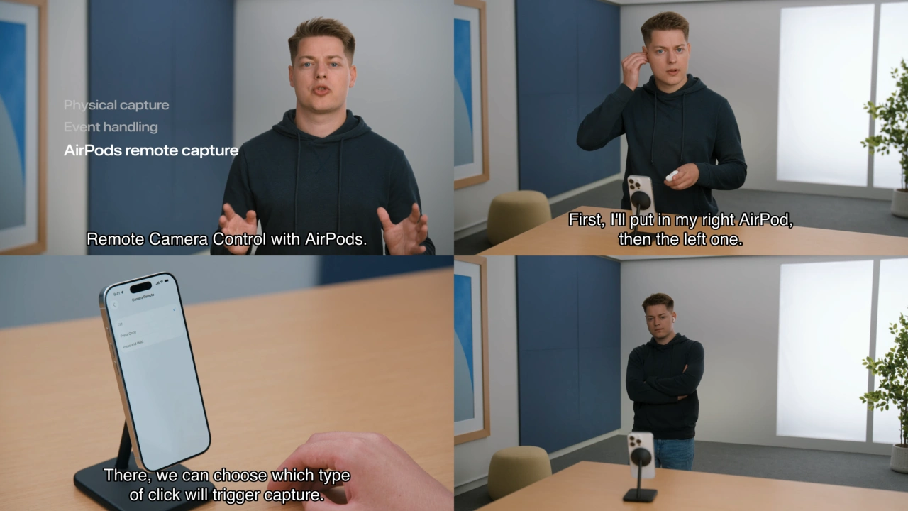 This year, we’re excited to announce that AVCaptureEventInteraction will also support primary actions triggered by clicks on either AirPod stem, specifically from AirPods equipped with the H2 chip. This will allow the user to remotely capture unforgettable moments without needing to interact with their phones.