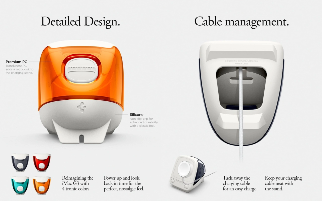 米SpigenがiMac G3デザインのiPhone用ケースClassic C1シリーズから、Apple Watchワイヤレス充電器用の「Apple Watch Classic C1 Charger Stand」を発売しています。詳細は以下から。