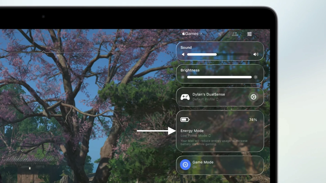 macOS 26 Tahoeでは、MacBook Air/Proを持ち歩き外でゲームをプレイする際、ゲームパフォーマンスを適度に維持しつつ、バッテリーの消費を抑えることができる「低電力モード (Low Power Mode)」がゲームモード中で利用できるようになるそうです。