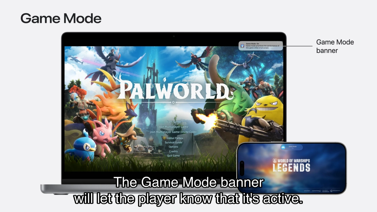 Appleは2023年009月にリリースしたmacOS 14 Sonomaで、数ミリ秒の反応や入力で優劣が左右されるゲームをMacで快適にプレイしてもらえるよう「ゲームモード (Game Mode)」を実装し、ゲームアプリが起動しゲームモードがONになると、