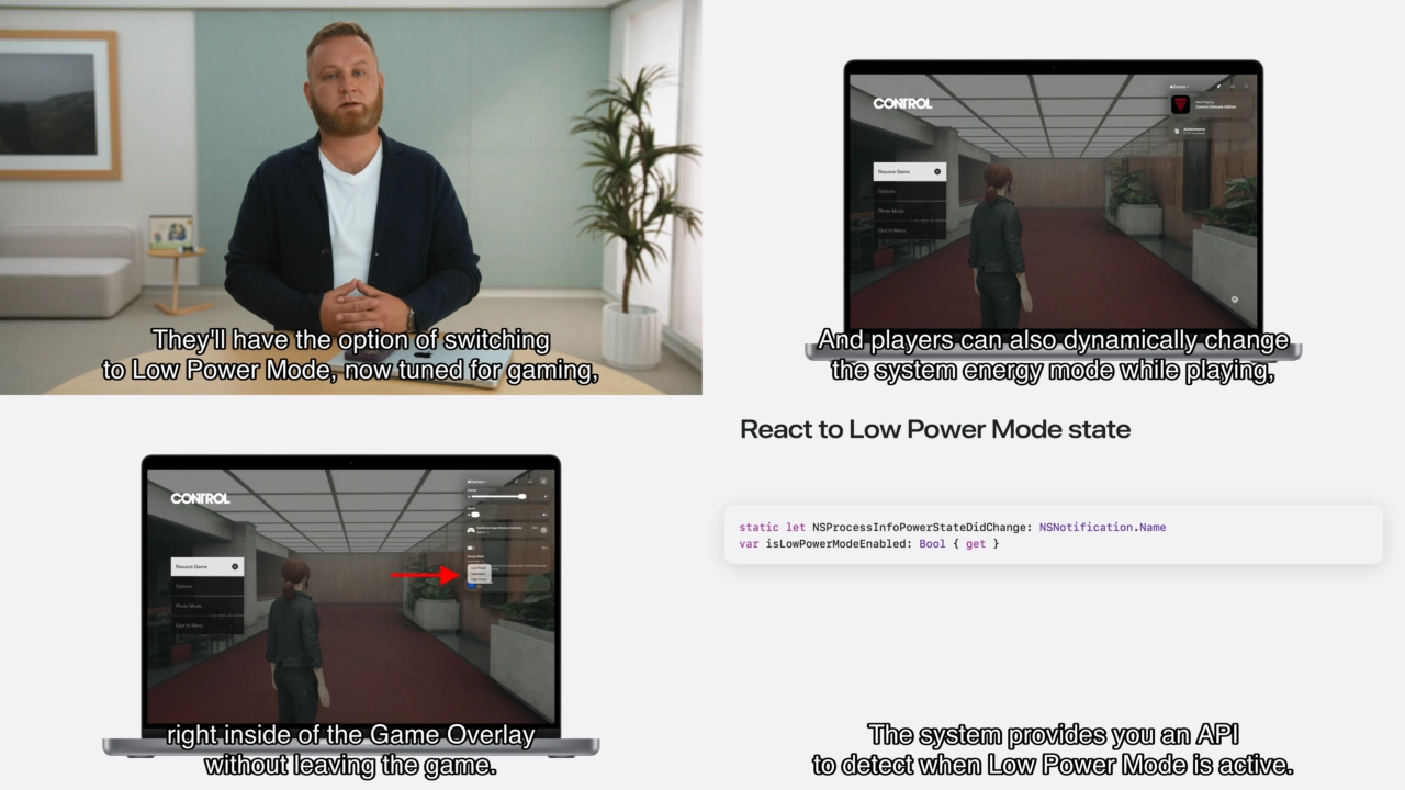 基調講演に続いて行われた「Platforms State of the Union」やセッション209「Level up your games」によると、Appleは次期macOS 26 Tahoeで、新たにゲームモード中の「低電力モード (Low Power Mode for Gaming)」がサポートされるそうです。