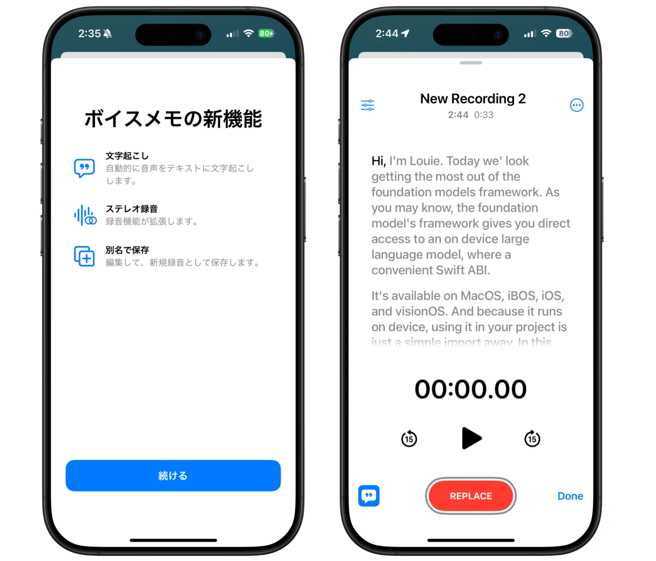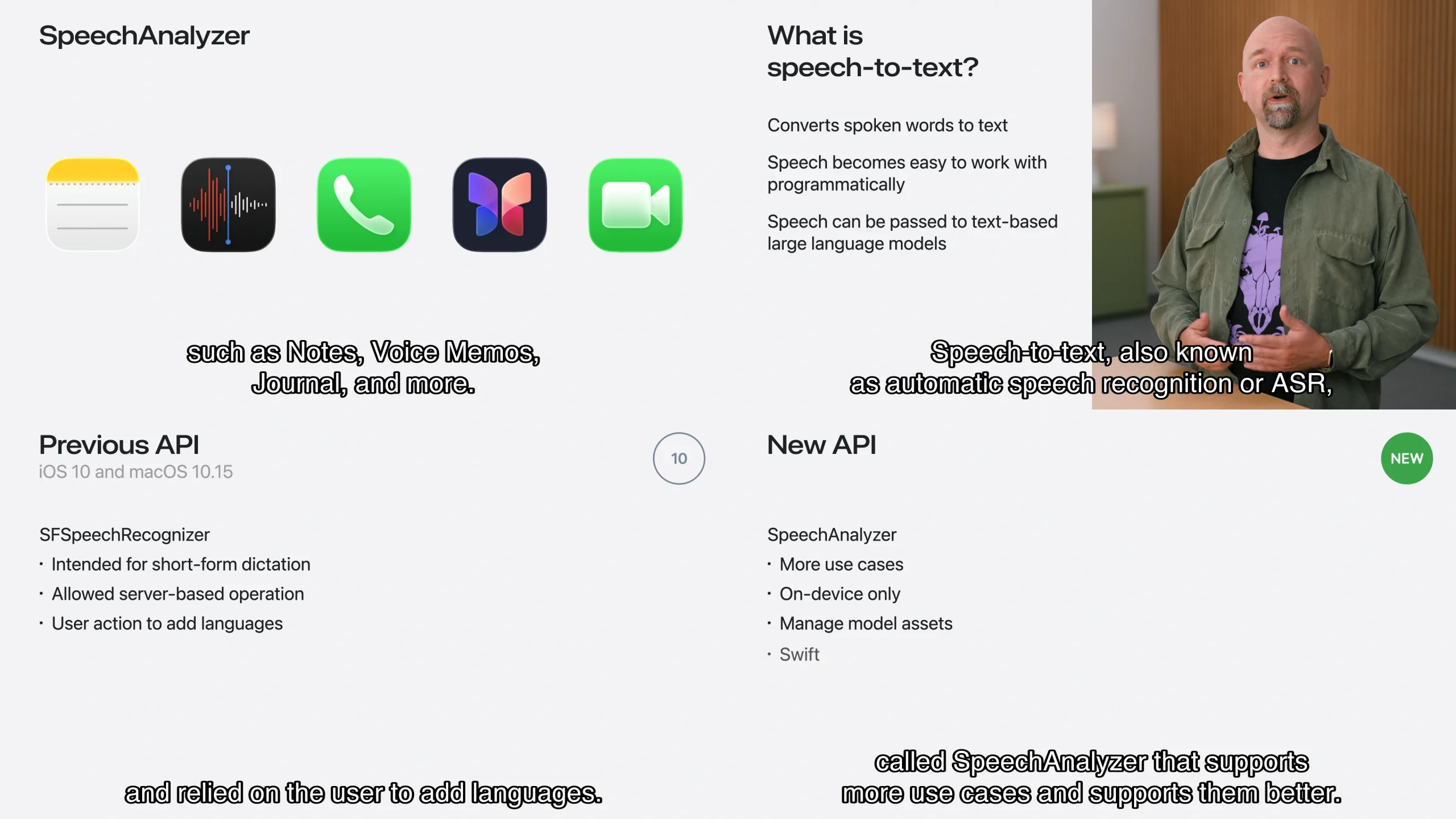AppleでSpeech Frameworkエンジニアと務めるDonovan VossさんにとNotesエンジニアを務めるShantini Vyasさんによると、SpeechAnalyzer APIは約10年前の2016年09月にリリースされたiOS 10や、2019年リリースのmacOS 10.15 Catalinaで導入した「SFSpeechRecognizer API」に代わる全く新しい音声文字起こしモデルで、旧SFSpeechRecognizer APIはSiri用音声モデルで処理はサーバーベースで、1分程度の短い音声での使用が推奨されていましたが、