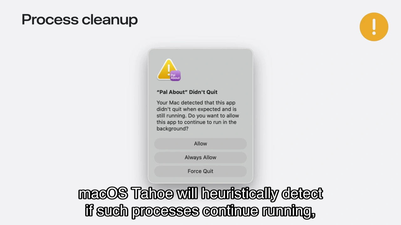 Also on macOS, note that all app processes should be terminated when someone decides to quit the app. If you load processes using fork, exec, or POSIX spawn, clean up those processes on exit. macOS Tahoe will heuristically detect if such processes continue running, then show users a prompt to confirm if this aligns with their intent.