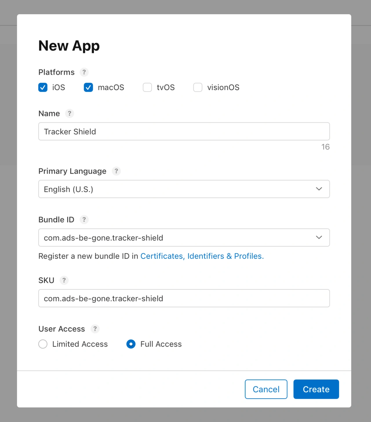 AppleのSafari機能拡張チームでエンジニアリングマネージャーを務めるDavid Johnsonさんによると、Safari Web Extension PackagerはApp Store Connectサービスの1つとして提供されており、利用するにはApp Store ConnectでAppレコードを作成し、配布するアプリ(機能拡張)の名前やバンドルID、SKUなどを設定しアプリを[作成]をクリックします。