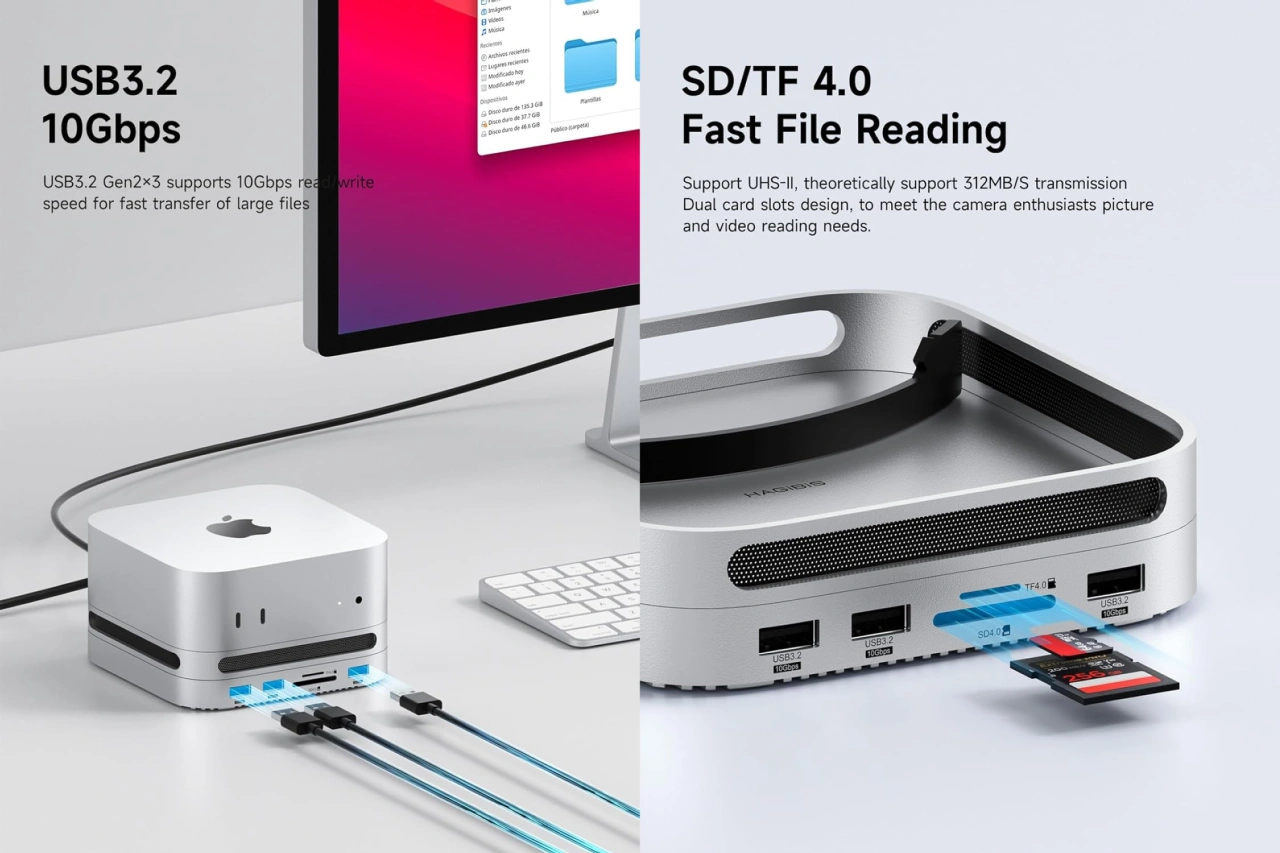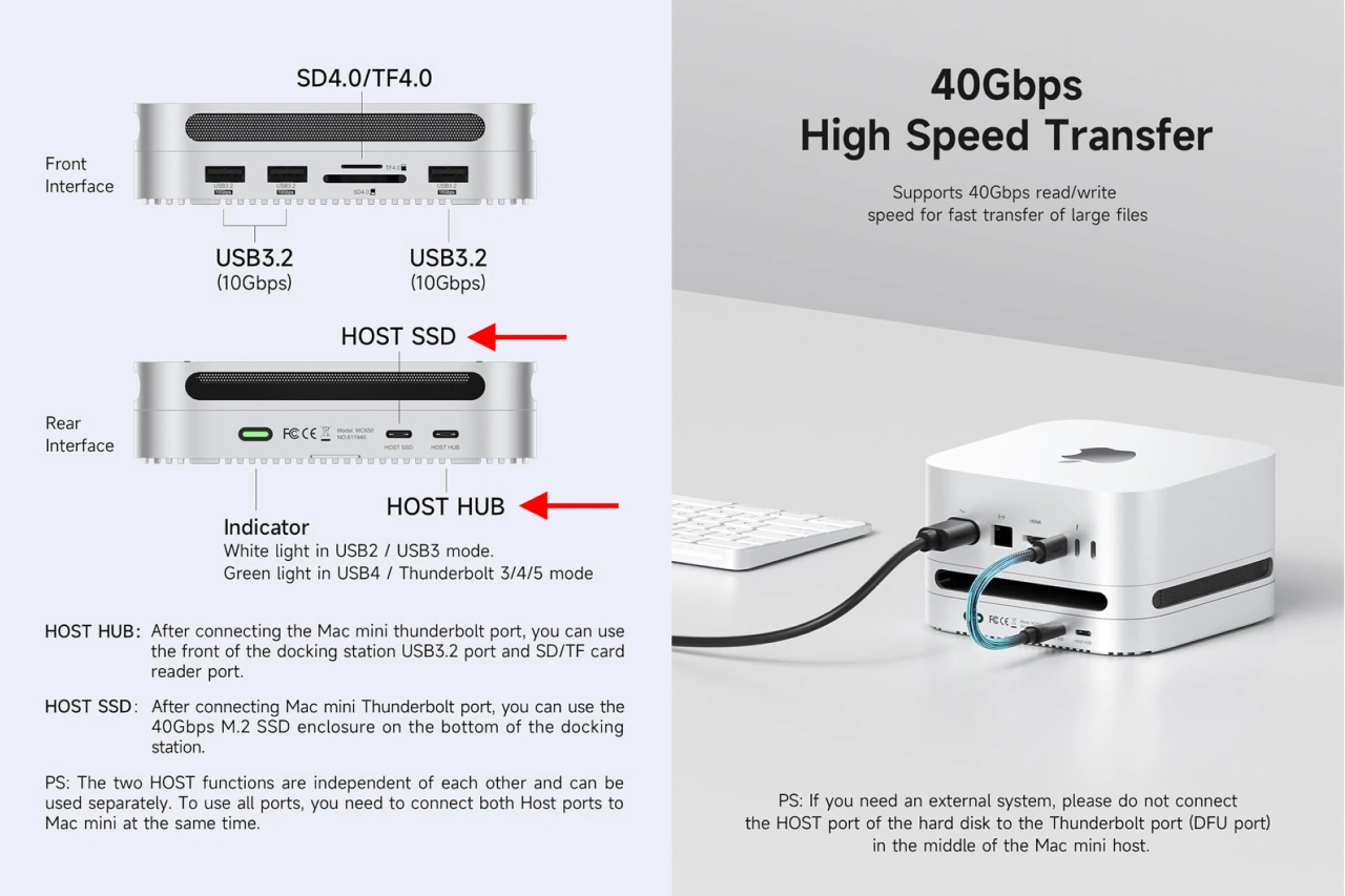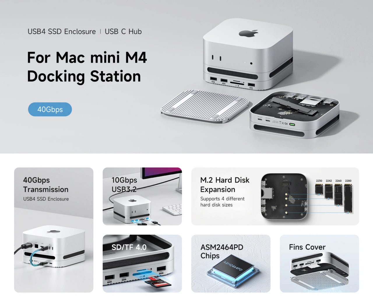 中国のサードパーティメーカーHagibisは先月、最大データ転送速度10Gbpsに対応したNVMe SSDスロット付きのUSB-Cハブと防塵フィルター付きのスタンドをセットにしたMac mini (2024)用ハブ「Hagibis Mac mini M4 Hub with M.2 SSD Enclosure & Dustproof Stand (MC65/MC65H)」を発売しましたが、新たに2つのホスト接続用USB-Cポートを備えたNVMe SSD付きUSBハブ「Hagibis Mac mini M4 Hub with 40Gbps M.2 SSD Enclosure & Dustproof Stand (MC650)」を発売しています。