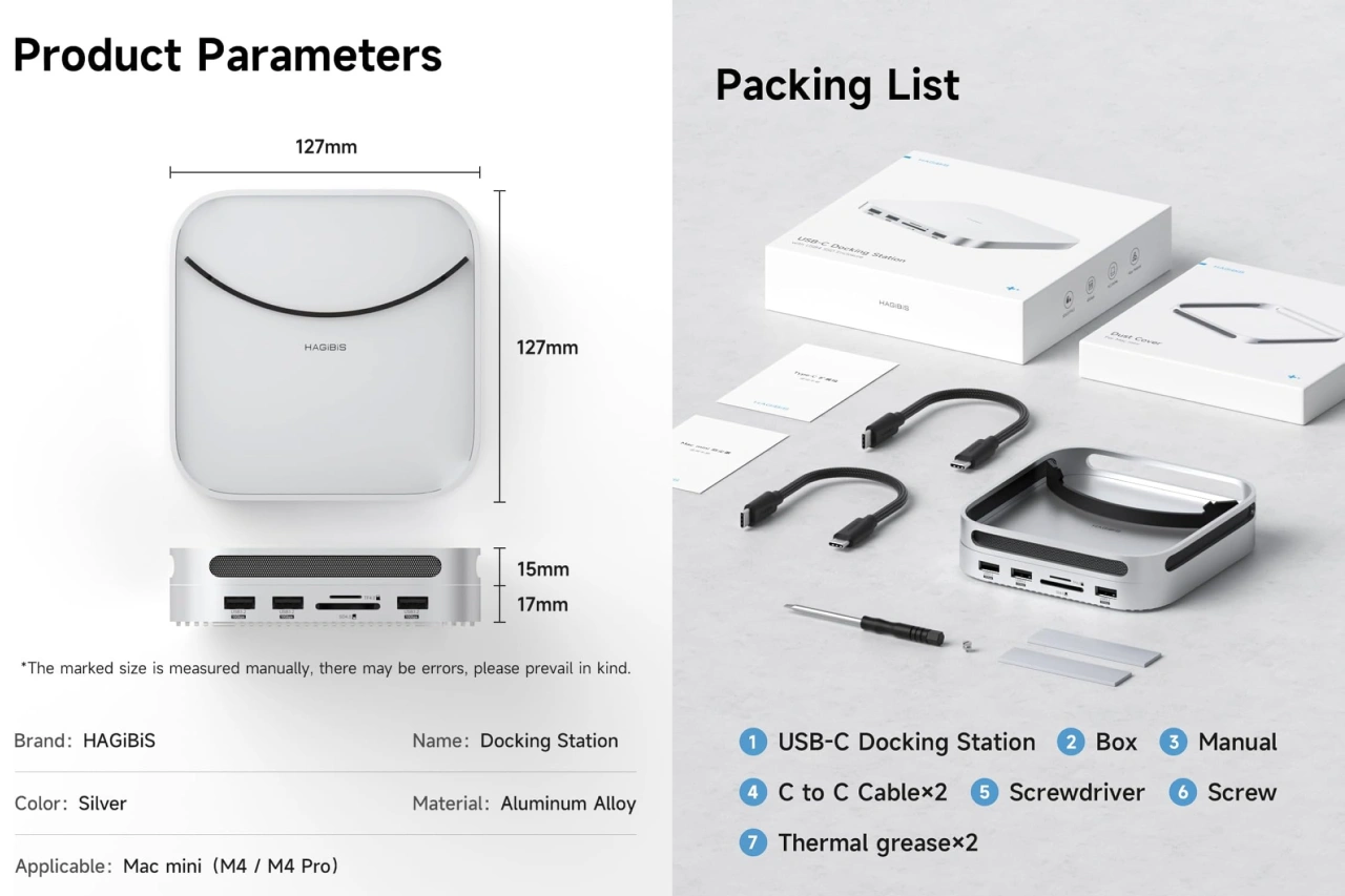 Hagibis Mac mini M4 Hub with 40Gbps M.2 SSD Enclosureはアルミニウム合金製でサイズは約127 x 127 x 17mm、パッケージには0.8mm穴のフィルターを搭載しMac mini内にホコリやゴミが入るのを防ぎ、Mac miniのエアフローを改善するスタンドとUSB-C to -Cケーブル2本、サーマルパッド2枚、NVMe SSD固定用のドライバーが付いて、価格は109.99ドルとなっています。