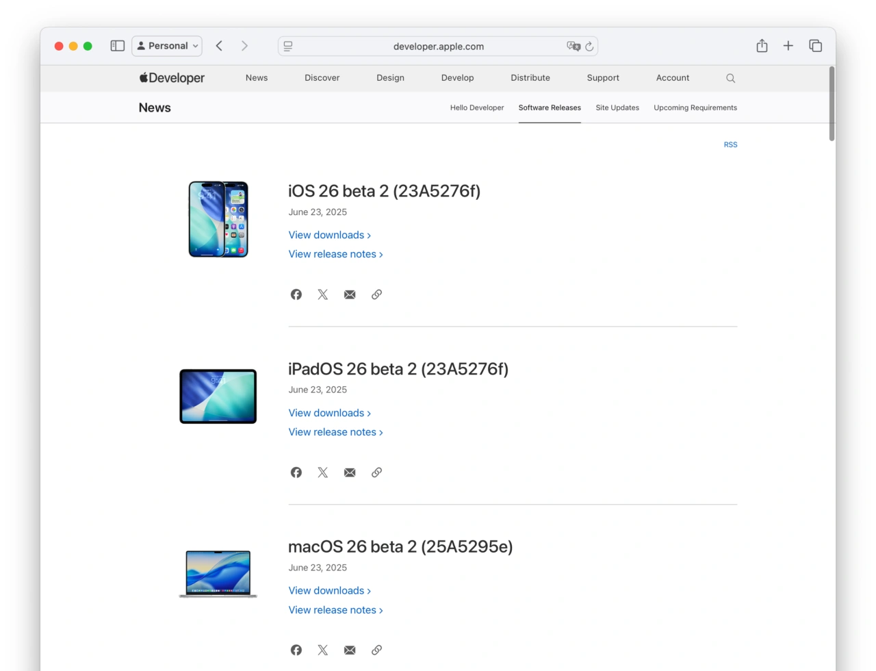 Appleは現地時間2025年06月24日、06月09日のWWDC25の基調講演で発表した「macOS 26 Tahoe」や「iOS/iPadOS 26」、「visionOS 26」などのBeta 2を開発者向けに公開しています。