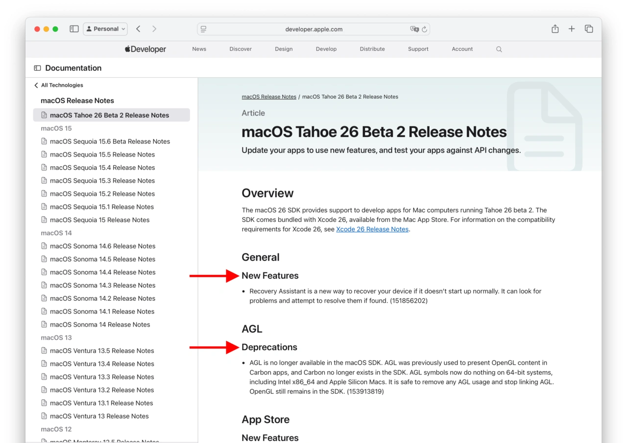 Appleが公開したリリースノートによると、macOS 26 Tahoe Beta 2やiOS/iPadOS 26では、MacやiPhone/iPadが正常に起動しない場合に問題を検出し、復旧を試みる「リカバリーアシスタント (Recovery Assistant)」が追加され、macOSではOpenGLを使用するためのCarbon API AGL (Apple Graphics Library)がmacOS SDKから削除されたそうです。