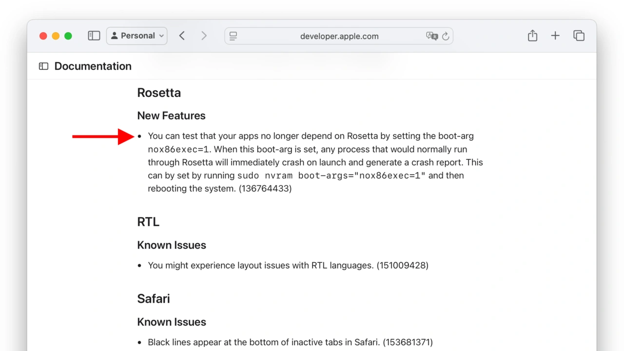 You can test that your apps no longer depend on Rosetta by setting the boot-arg nox86exec=1. When this boot-arg is set, any process that would normally run through Rosetta will immediately crash on launch and generate a crash report.macOS Tahoe 26 Beta 2 Release Notes – Apple Developer Documentation