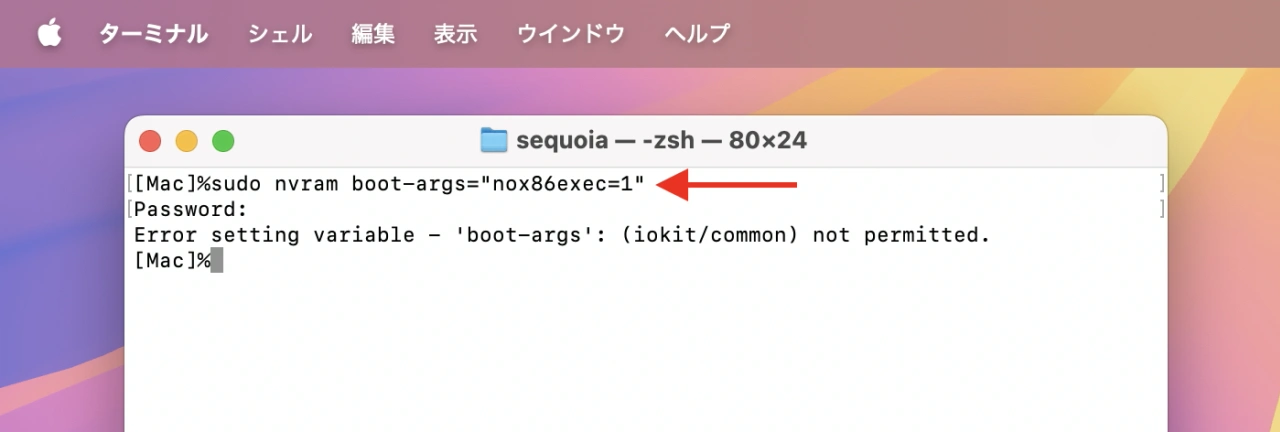新しいブートプションは、ターミナルを開いて以下のコマンドを打ち込むだけで、nox86execを有効(1)にして起動するとRosettaを利用して実行されるプロセス(x86_64アプリやバイナリ)は起動時に即クラッシュし、クラッシュレポートが作成されるようになるそうです。