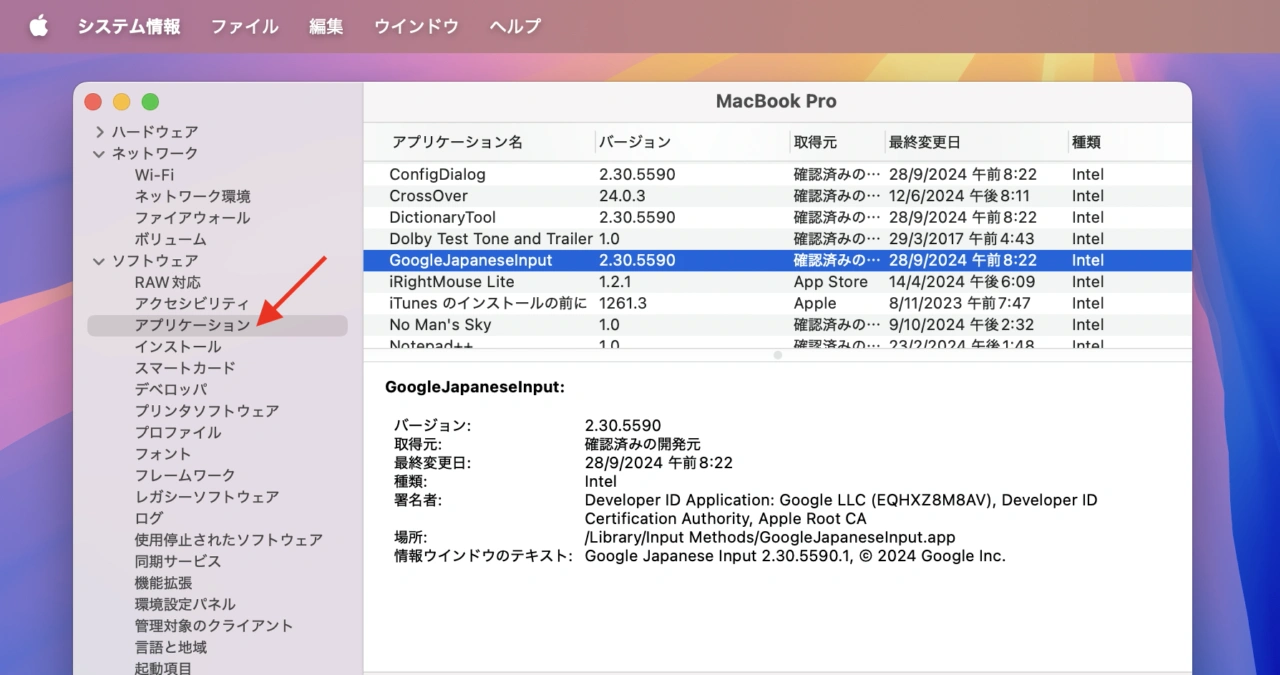 x86_64フレームワークやライブラリなどの依存性は確認できませんが、システム情報アプリアプリの左サイドバーにある[ソフトウェア] → [アプリケーション]をクリックすると、現在Macにインストールされている全てのアプリがリストアップされ、[種類]のカラムでApple Silicon Macでネイティブ動作するApple Silicon/Universalアプリか、Rosetta 2を必要とするIntelアプリかをチェックすることも出来ます。
