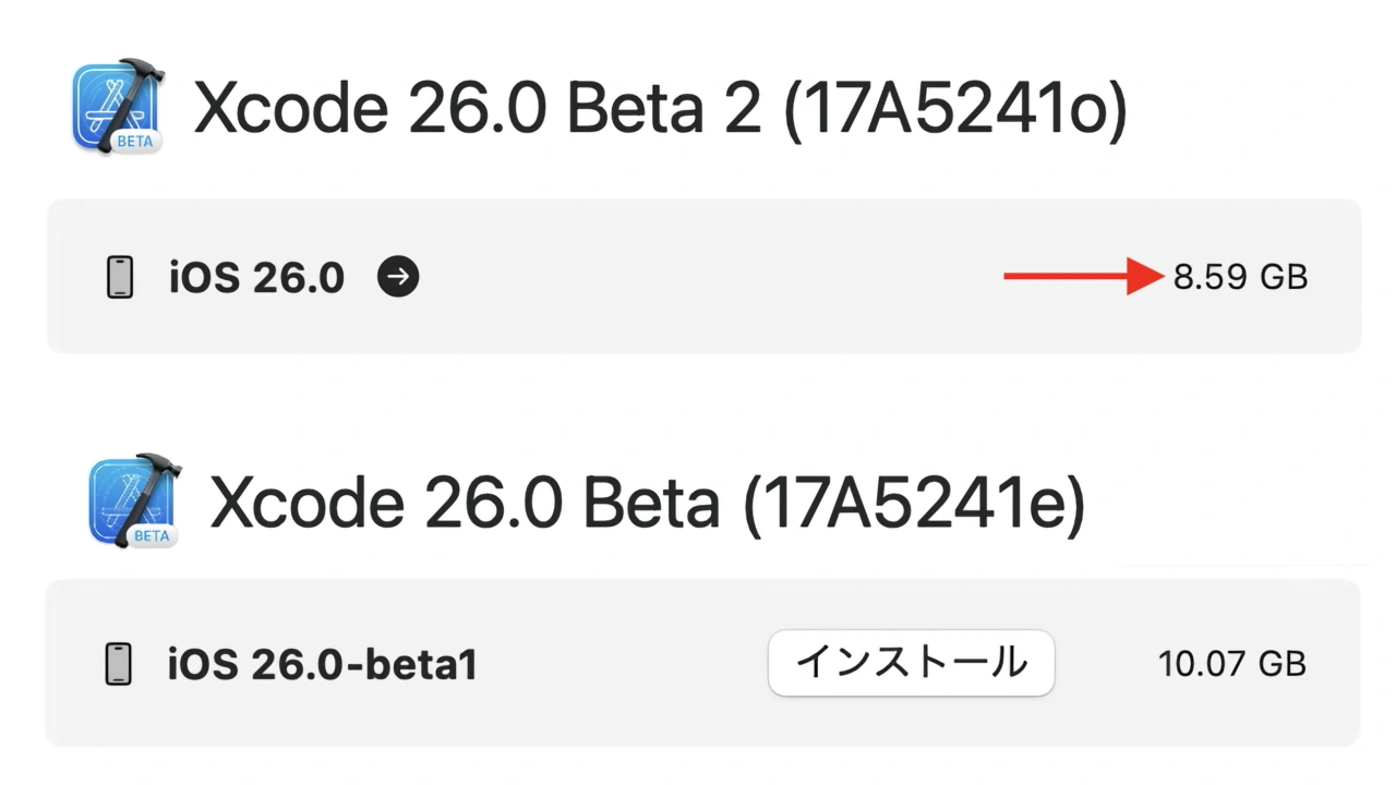 これまでと同じ、Intel MacをサポートするUniversal (arm64+x86_64)版に分けて提供を開始したそうで、これによりApple Silicon Macでは、ダウンロードされるランタイムのサイズがiOS 26-beta1より約1.5GBほど小さくなっているので、Apple Silicon MacでXcode 26 Beta 2をお使いの方はチェックしてみてください。