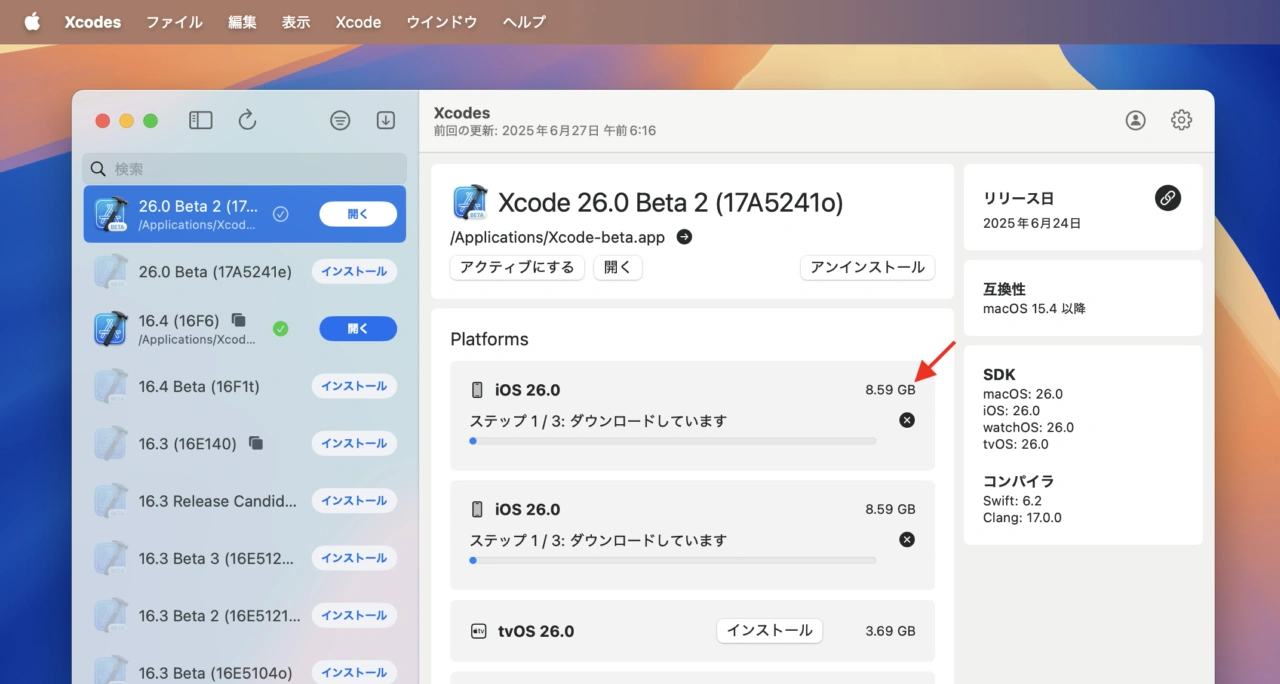 Xcodes-AppでのiOS 26.0-beta2ダウンロード