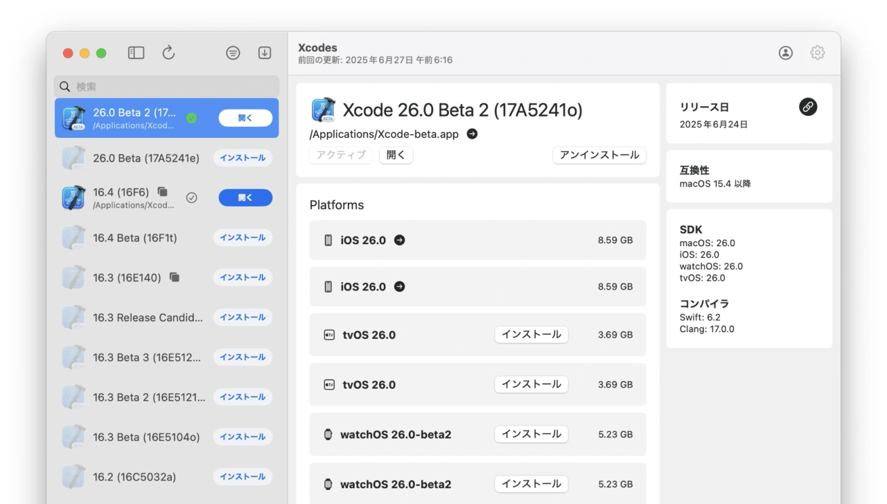 Xcodeを最大16コネクションで高速にダウンロードでき、バージョンの管理も可能なオープンソースツール「Xcodes App」を開発するカナダRobots & PencilsのMatt Kiazykさんによると、AppleはXcode 26 Beta 2からiOS 26やtvOS 26、watchOS 26、visionOS 26-beta2のランタイムをApple Silicon Mac用のarm64のみと、